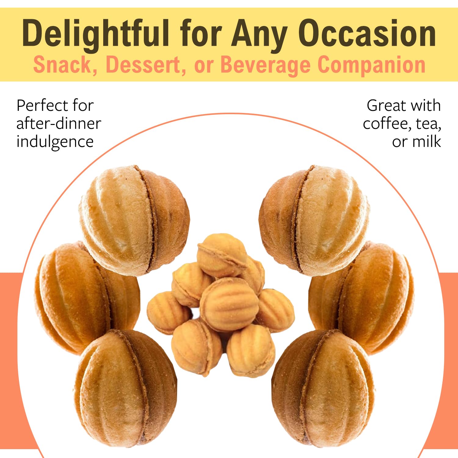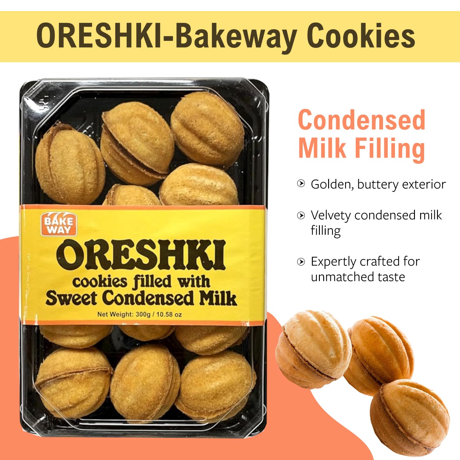 - Q: What makes ORESHKI cookies different from other cookies? A: ORESHKI cookies feature a unique golden walnut shape and are filled with a rich, velvety condensed milk center, offering a delightful contrast of crunchy and creamy textures. These traditional cookies are inspired by Eastern European baking heritage, making them a distinctive treat.