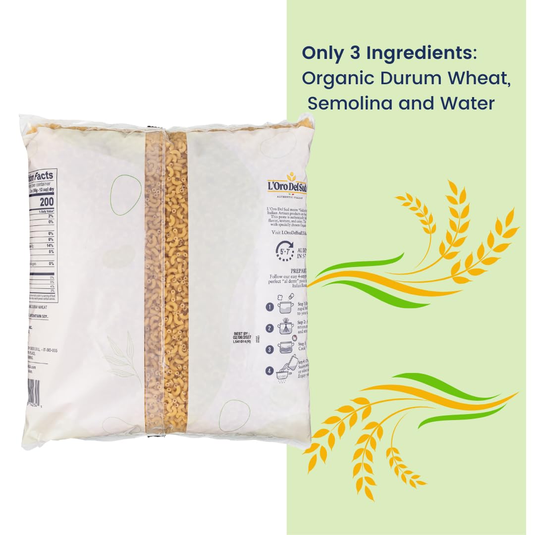 Q: What are the main ingredients in L'Oro Del Sud Organic Elbows Pasta?A: L'Oro Del Sud Organic Elbows Pasta is made from 100% durum wheat semolina, ensuring high quality and authentic Italian taste without any additives or chemical preservatives.