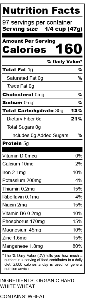 Q: Are Organic Hard White Wheat Berries gluten-free?A: No, Organic Hard White Wheat Berries contain gluten and are not suitable for those with gluten intolerance or celiac disease.