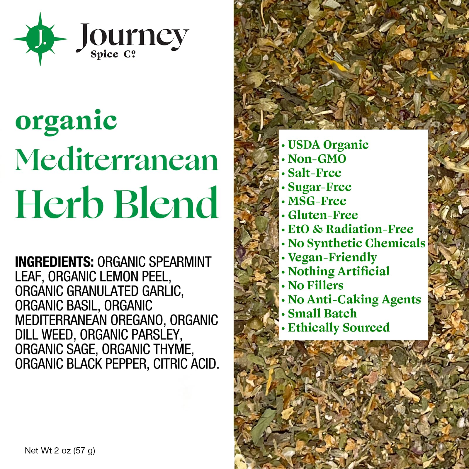 - Q: What dishes can I use the Organic Mediterranean Herb Blend with? A: The Organic Mediterranean Herb Blend is versatile and can be used with various dishes such as chicken, pork, vegetables, tzatziki sauce, rice, pasta, and many Mediterranean recipes. It's an excellent choice for enhancing the flavor of salads and poultry.