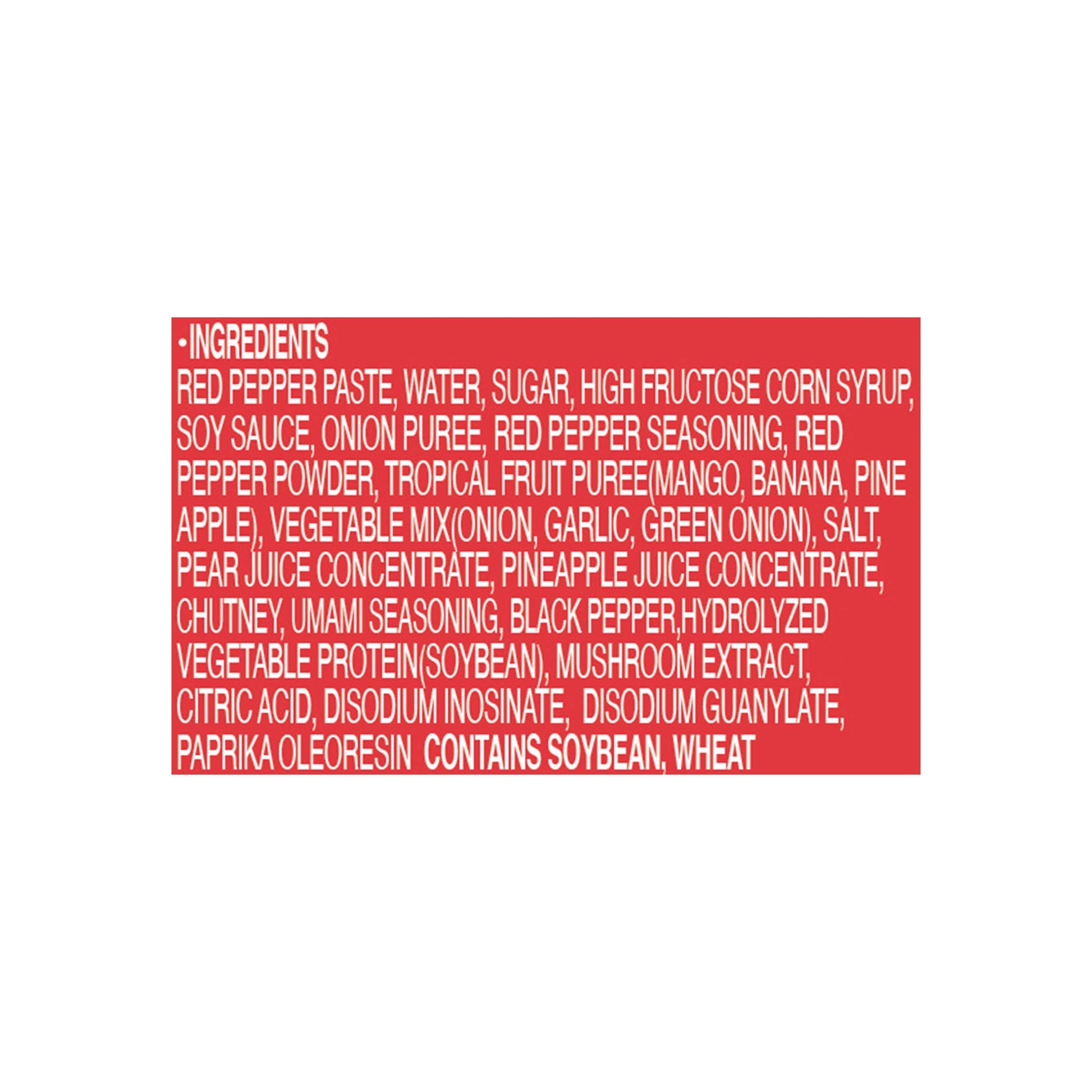 Q: What are the main ingredients in Ottogi Authentic Korean BBQ Sauce?A: Ottogi Authentic Korean BBQ Sauce is made with a perfect combination of 7 different tropical fruits, herbs, and spices, creating a unique and flavorful hot and spicy marinade for various dishes.
