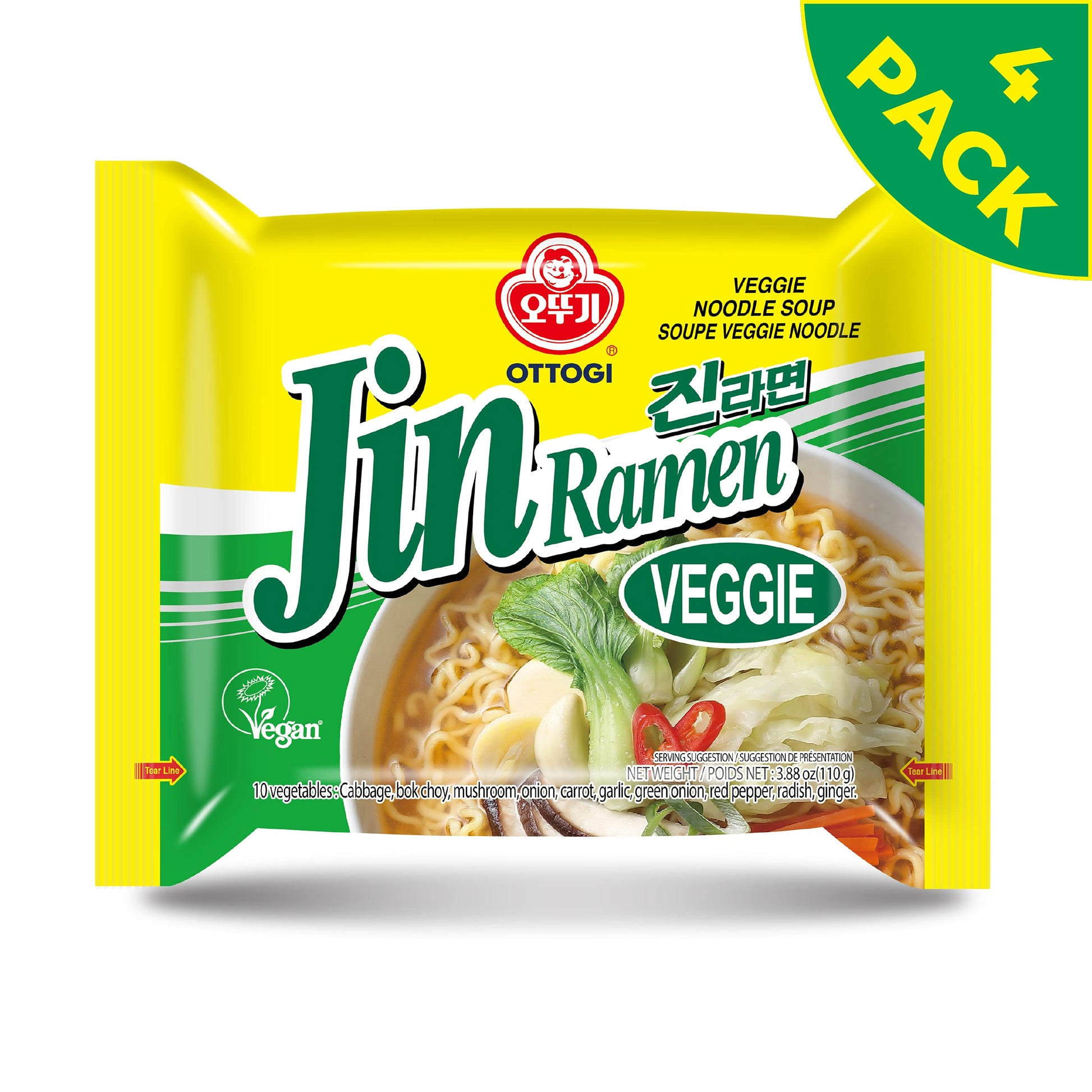 - Q: What is the serving size of Ottogi Jin Ramen Veggie? A: Each pack of Ottogi Jin Ramen Veggie is three point eight eight ounces, and the product comes in a pack of four, providing multiple servings for convenient meal options.