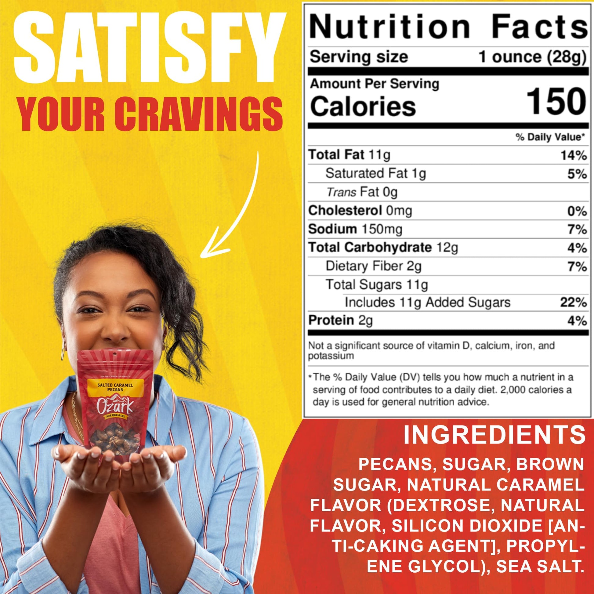 - Q: What are the main ingredients in Ozark Nut Roasters Salted Caramel Pecans? A: The main ingredients include USA grown pecans, granulated sugar, brown sugar, sea salt, and natural caramel flavor. These ingredients combine to create a sweet and salty flavor profile.