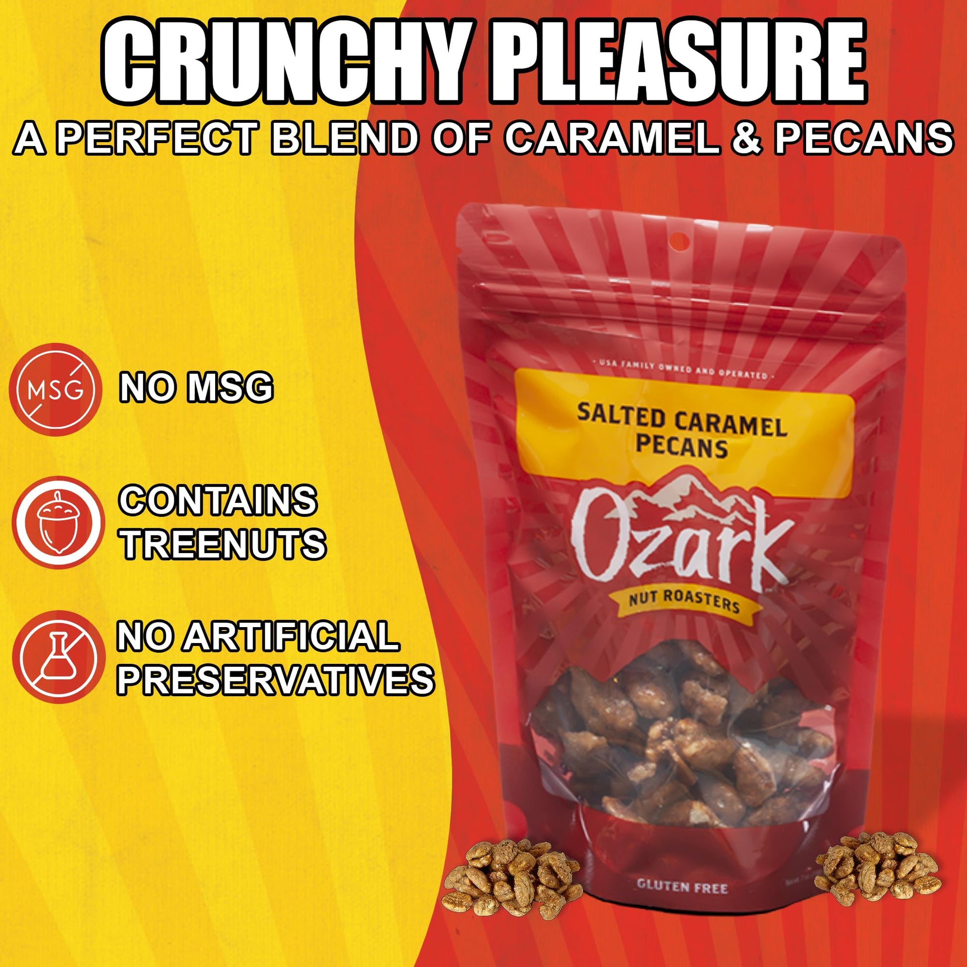 - Q: Are there any artificial flavors or preservatives in these pecans? A: No, Ozark Nut Roasters Salted Caramel Pecans are made with 100% natural flavors and ingredients, ensuring that there are no artificial additives or preservatives.
