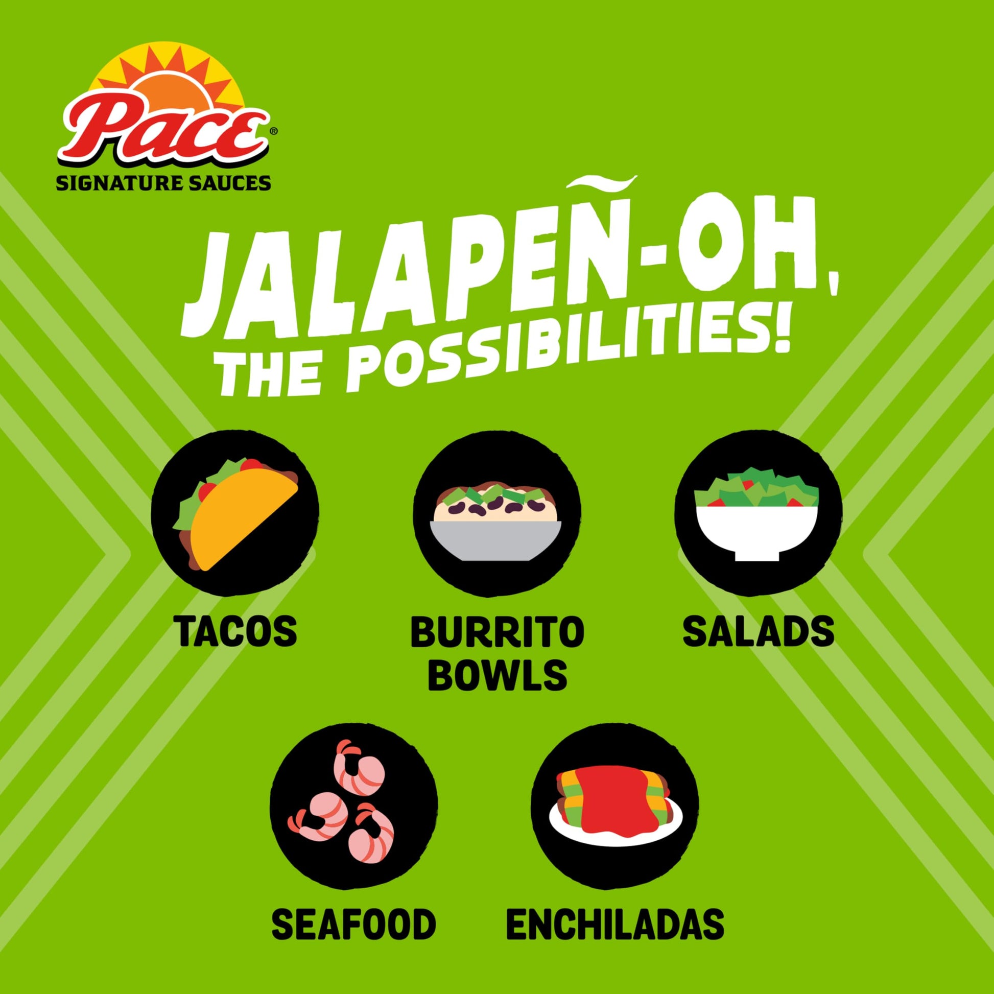Q: What is Pace Cilantro Jalapeno Lime Signature Sauce best used for?A: Pace Cilantro Jalapeno Lime Signature Sauce is versatile and can be used as a condiment for tacos, enchiladas, sandwiches, and salads. It's perfect for summer grilling, tailgating, and any festive occasion where you want to add a flavorful kick to your dishes.