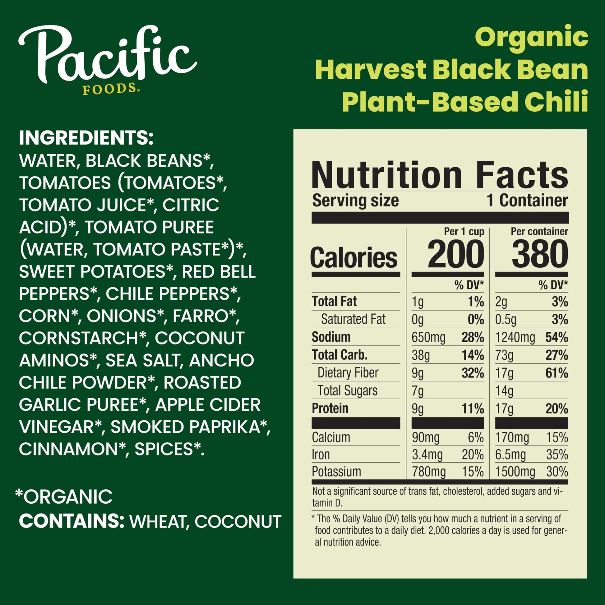 Immerse Your Taste Buds Into Something Truly Unique With Pacific Foods Organic Harvest Black Bean Chili. Made Using Time-Honored Recipes, This Plant Based Canned Chili Features Delicious Black Beans Combined With Sweet Potato, Corn And Farro To Create The Perfect Balance Of Savory, Sweet And Smoky. Enjoy This Plant Based Chili On Its Own As A Quick And Easy Vegetarian Snack, Customize It With Your Favorite Toppings, Or Pair It With A Salad, Sandwich Or Wrap. You Can Also Use It In Recipes Like Chili Dogs Or Homemade Dips And Appetizers. Usda-Certified Organic And Made With Non-Gmo Ingredients, This Vegetarian Chili Contains 17 Grams Of Protein And 17 Grams Of Fiber Per Can. To Prepare, Simply Pour, Heat Until Hot, Stir And Enjoy. Every Spoonful Of Our Organic Stew Is Satisfying To The Last Drop. In Addition To Harvest Black Bean Chili, Our Pacific Foods Line Of Plant Based Soups Includes Fire Roasted Vegetable Chili And White Bean Verde Chili. At Pacific Foods, We'Re Dedicated To Making The Most Nourishing Foods Possible From Simple, Carefully Sourced Ingredients.