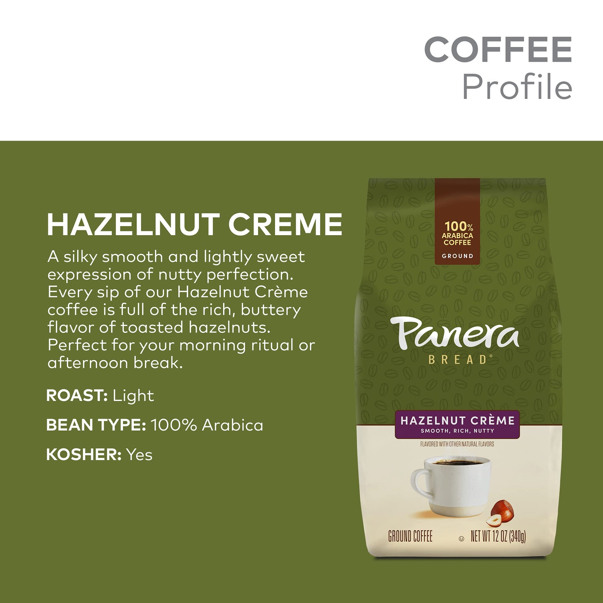 The Perfect Light Roast Coffee For Your Morning Ritual Or Your Afternoon Break, Panera Hazelnut Crme Is Rich Roasted, Light Roast Coffee Balanced With The Irresistible Flavor Of Buttery, Toasted Hazelnuts. Its A Silky Smooth And Lightly Sweet Expression Of Nutty Perfection. At Panera, We Think Coffee Should Taste Good, Smell Good, Feel Good. It Should Be Clean - Just Like Our Food. Thats Why Every Day In Our Cafes We Brew From 100 Percent Arabica Beans, Roasted By People Who Know How To Make Great Coffee. And We Think You Deserve All Those Great Tastes, Smells, And Feels Where You Are, Too. Thats Why We Made It Easy To Enjoy The Taste Of All Your Favorite Panera Coffee Varieties At The Touch Of A Button - All From The Comfort Of Home. Every Bag Of Panera Ground Coffee Is Filled With Expertly Sourced Coffee, Perfectly Roast And Ground So You Can Enjoy A Delicious, Full-Flavored Cup Every Time You Brew. Enjoy A Carafe With The Keurig K-Duo Series Of Coffee Makers, Or Brew A Single Cup Just For You Using Any Keurig K-Cup Pod Single-Serve Coffee Maker And The Keurig My K-Cup Universal Reusable Coffee Filter (Sold Separately). Certified Union Orthodox Kosher.