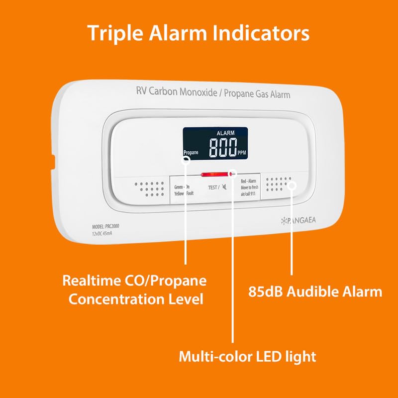 Q: What types of gases does the PANGAEA RV Carbon Monoxide & Propane Dual Gas Detector detect?A: The PANGAEA RV Carbon Monoxide & Propane Dual Gas Detector efficiently detects both carbon monoxide (CO) and propane (LPG) gases, ensuring maximum safety in your RV or motorhome.