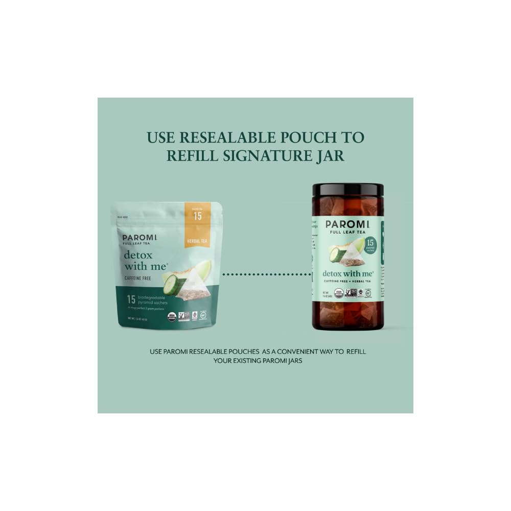 - Q: What is the packaging of Paromi Detox With Me Rooibos Tea like? A: The tea comes in pyramid sachets made from plant-based materials, packaged in a signature reusable glass jar. This ensures the tea remains fresh, fragrant, and flavorful.