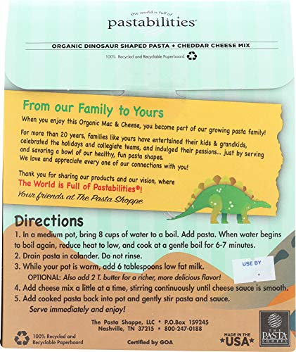 Q: Is PASTABILITIES Organic Dinosaur Mac 'n Cheese made with organic ingredients?A: Yes, PASTABILITIES Organic Dinosaur Mac 'n Cheese is made with organic ingredients, ensuring a healthier choice for your family.