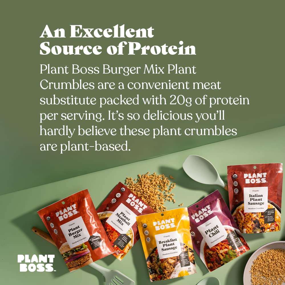 - Q: How do I prepare the Plant Boss Plant Burger Mix? A: To prepare the Plant Boss Plant Burger Mix, stir the seasoned crumbles into 2 cups of water and let soak for 3 minutes. Then, heat oil in a skillet over medium heat for 1 to 2 minutes. Add the crumbles and water mixture to the pan, stir occasionally, and cook for 15 to 20 minutes until the moisture is absorbed.
