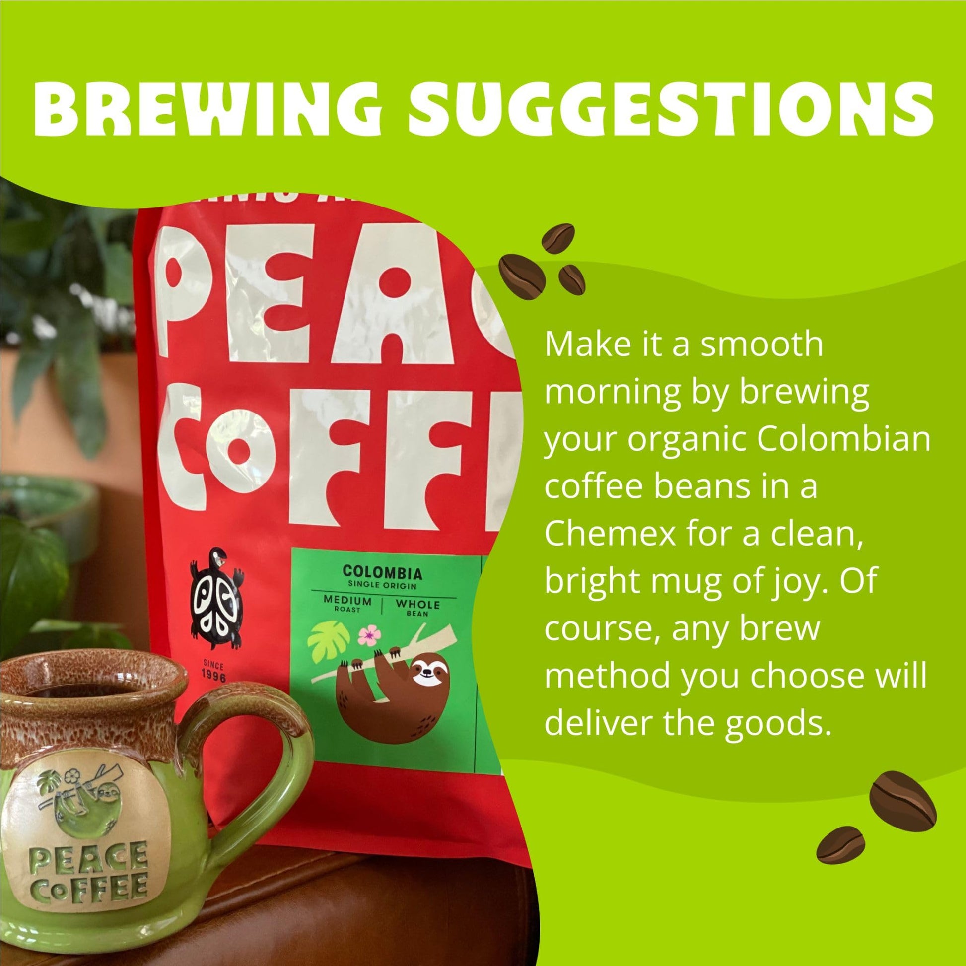 - Q: What makes Peace Coffee Colombia Single Origin Coffee unique? A: Peace Coffee Colombia Single Origin Coffee is crafted from high-quality organic Colombian coffee beans, sourced from smallholder farmers. It features a harmonious blend of flavor notes including brown sugar, stone fruit, and clove, making it a standout choice for coffee lovers seeking a smooth and crisp taste.
