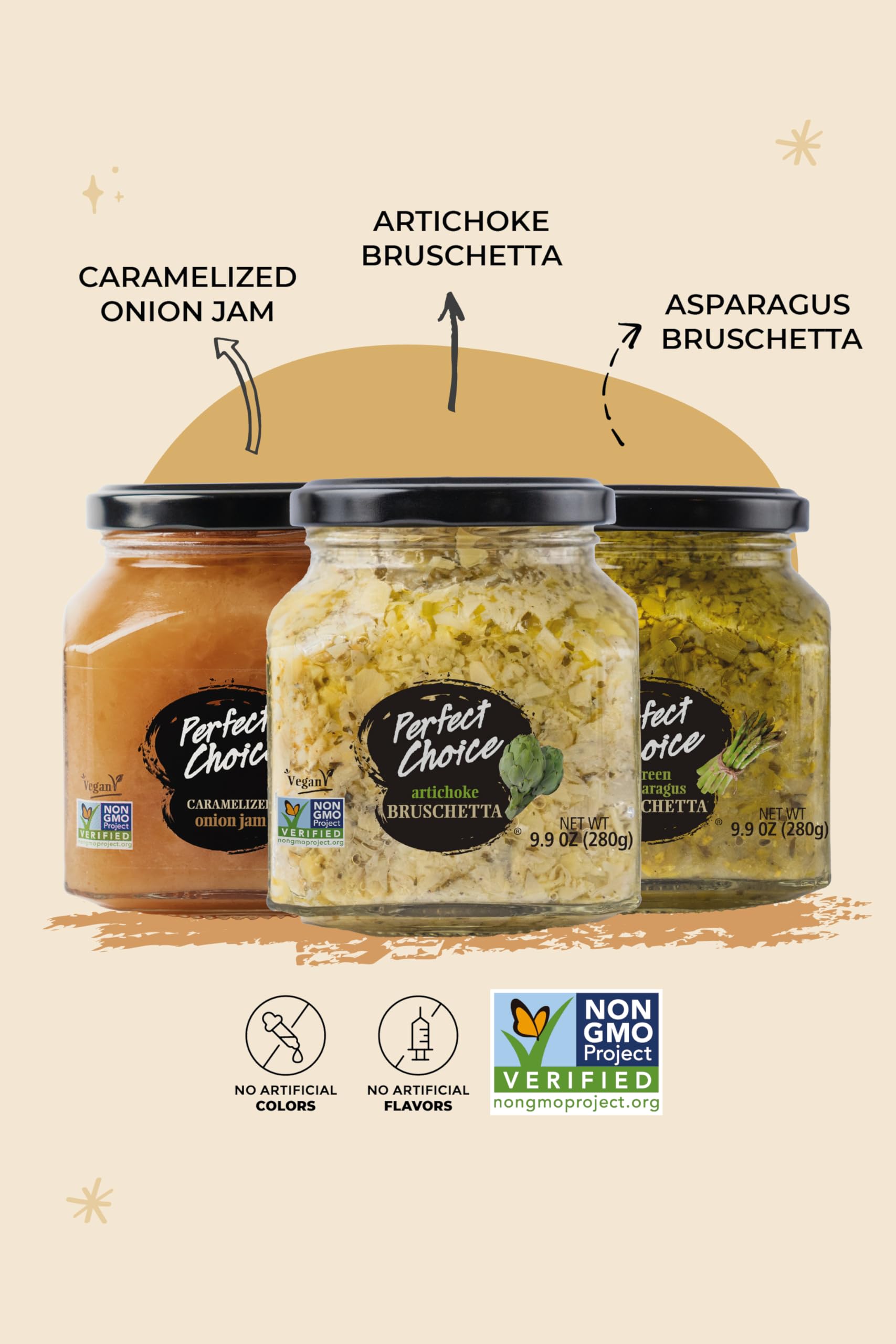 Perfect Choice aims to bring joy by offering delicious meals, unique flavors, and culinary experiments to food enthusiasts, using quality ingredients. Perfect Choice Variety Pack offers three tantalizing spreads, artichoke bruschetta, green asparagus bruschetta, and caramelized onion, each providing distinct flavors that elevate and diversify meals. Versatile in usage, the artichoke bruschetta enhances bread, snacks, sandwiches, and even lasagna. The caramelized onion spread adds a delightful sweet-savory touch to various dishes, while the green asparagus bruschetta enriches salads, bread, sandwiches, and pasta. With Perfect Choice turn something good into Perfect!