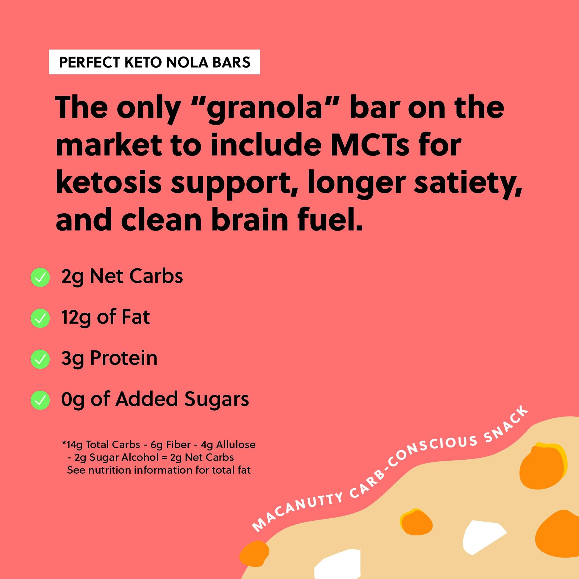 Introducing Perfect Keto Nola Bars—delicious and chewy low carb snacks designed to fit seamlessly into your keto diet. These keto-friendly granola-style bars come in delicious, delectable flavors like Coconut Chocolate Chip, Maple Pecan, Peanut Butter and White Chocolate Macadamia. Each bar provides just 2g of net carbs, 6g of fiber, 3g of protein, and 12g of quality fats, making them a satisfying option to enjoy any time of day. Infused with MCT oil, these bars offer a quick source of energy and help keep you feeling full. Whether you need a quick breakfast on-the-go, a pre workout pick-me-up, or a convenient snack during travel or outdoor activities, Nola Bars are your versatile companion. Made with wholesome ingredients like almonds, white chocolate flavored chips, macadamia nuts, MCT oil and natural sweeteners, these healthy snacks offer sustained energy without added sugars or unnecessary fillers. Enjoy the clean and satisfying taste of Perfect Keto Nola Bars whenever and wherever you need.