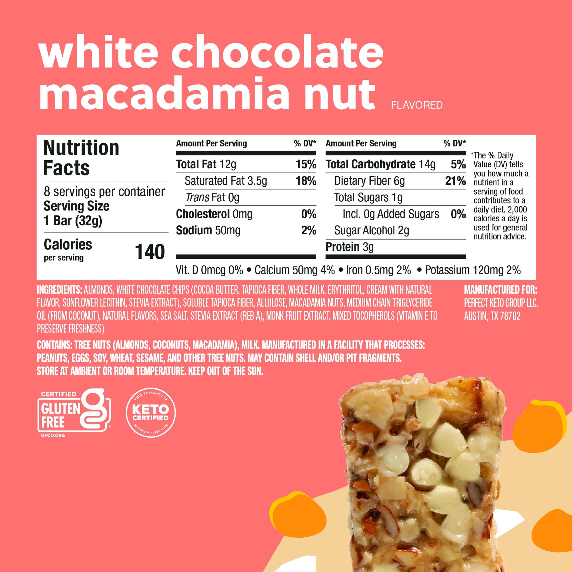 Perfect Keto Nola Bars, Gluten Free, Keto Granola Bars, Low Carb Snack Or Breakfast Bar With No Sugar Added, Keto Diet Food, Healthy Snacks For Adults, 2G Net Carb, White Chocolate Macadamia, 8 Pack