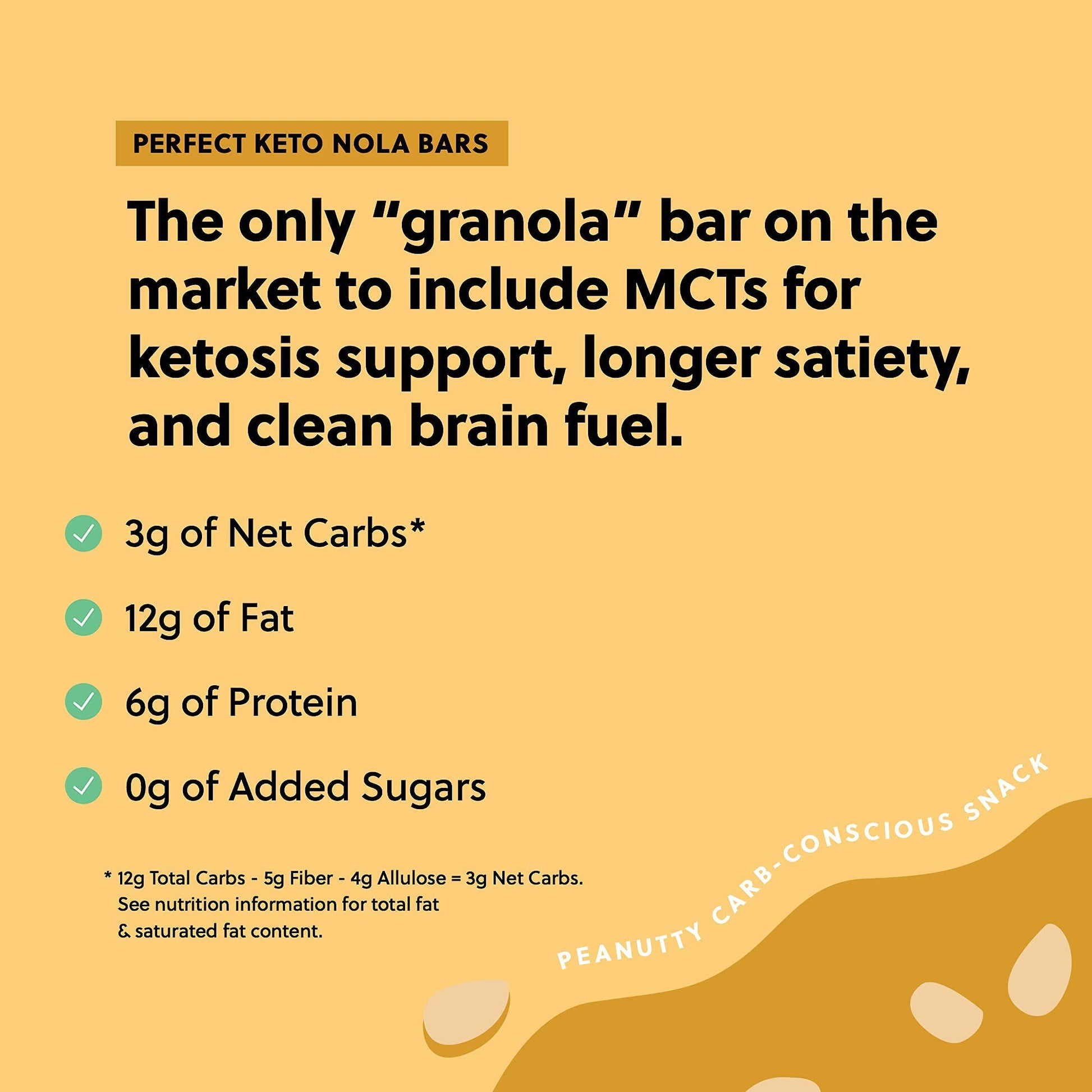 Q: What are the key ingredients in Perfect Keto Nola Bars?A: Perfect Keto Nola Bars are made with wholesome ingredients including almonds, peanuts, organic coconut, and sea salt. These bars are gluten-free and contain no artificial colors, flavors, or fillers.