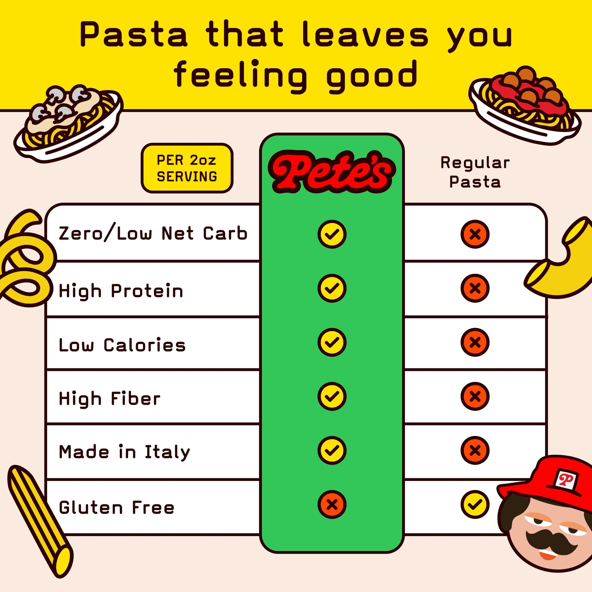 Q: Is Pete's Pasta suitable for a keto diet?A: Yes, Pete's Pasta is an excellent choice for keto diets. With 0g net carbs in the no-carb option and only 7g in the low-carb option, it supports your low-carb lifestyle while satisfying your pasta cravings.