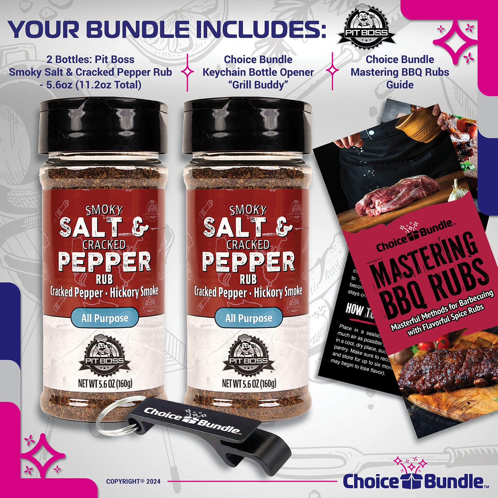 - Q: What is included in the bundle with the seasoning? A: The bundle includes two bottles of Pit Boss Smoky Salt & Cracked Pepper seasoning, an exclusive 'Mastering BBQ Rubs' guide, and a 'Grill Buddy' keychain bottle opener.