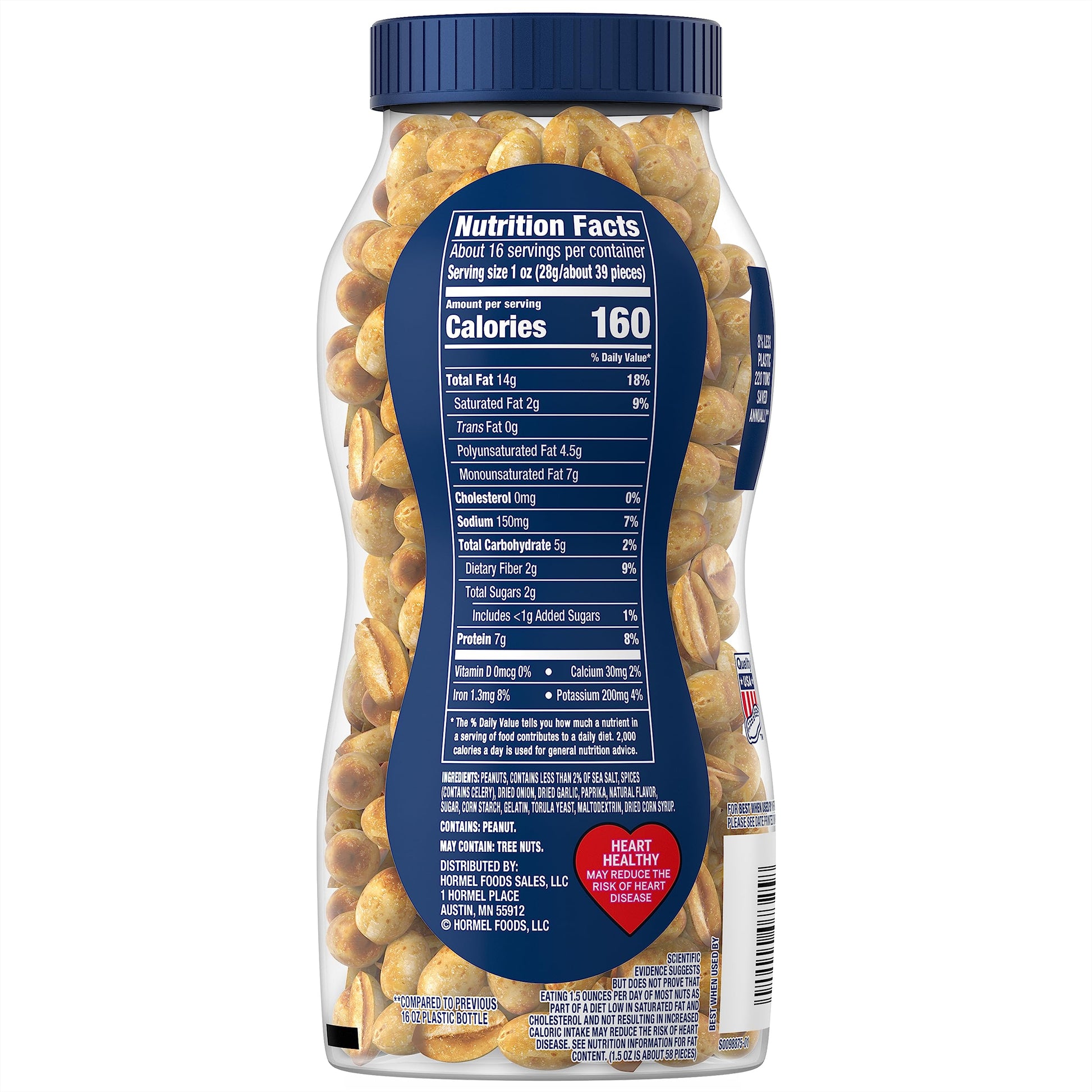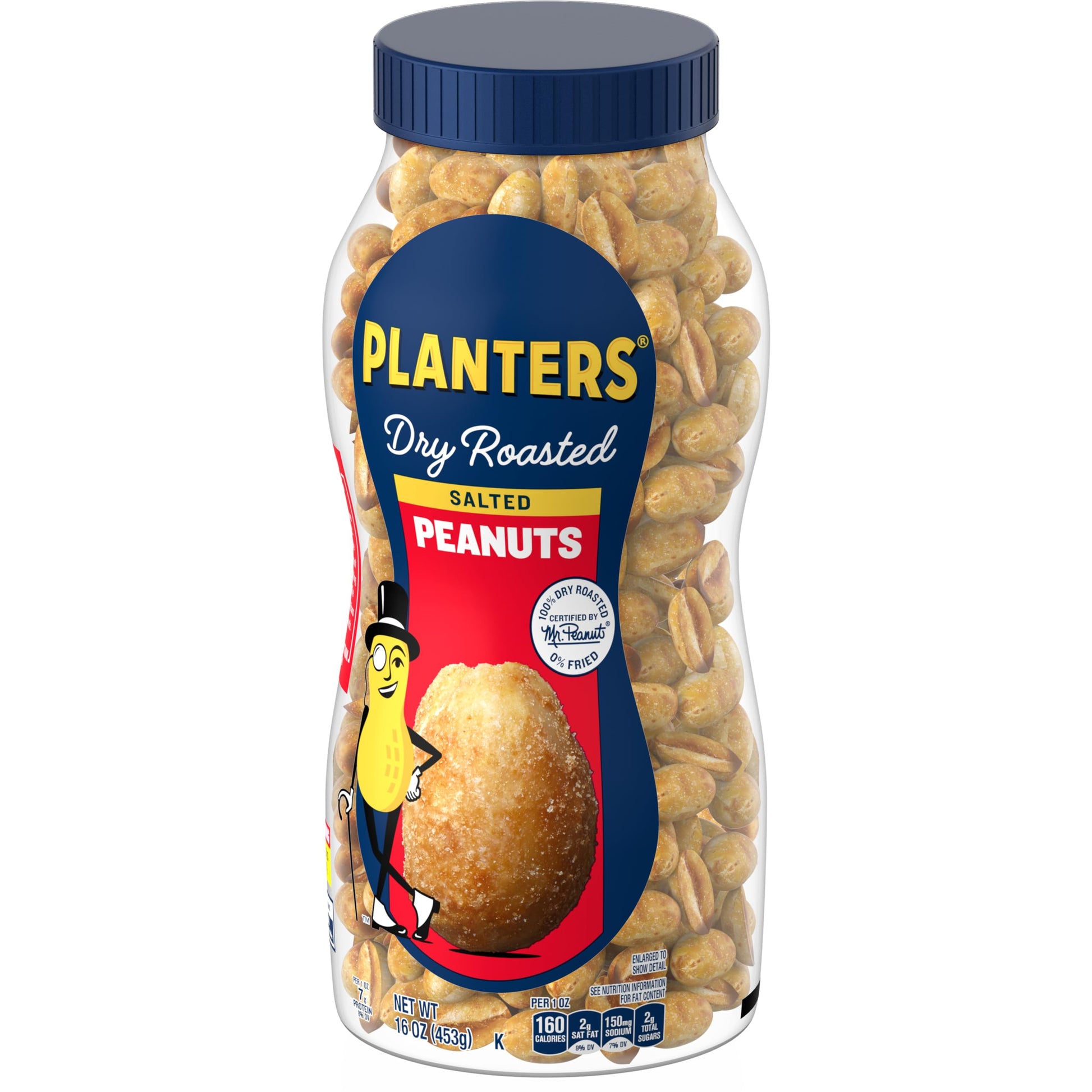 PLANTERS Salted Dry Roasted Peanuts are crafted with care to enhance their naturally nutty flavor. Packaged in a convenient 16-ounce resealable jar, these peanuts maintain their freshness and crunch, making them suitable for on-the-go snacking. Each serving delivers a satisfying experience, providing 7 grams of plant-based protein and containing 160 calories. With zero cholesterol and zero trans fat, they are a health-conscious option for snack lovers. The airtight container makes it easy to enjoy these peanuts during road trips, at the office, or during game nights with friends and family.