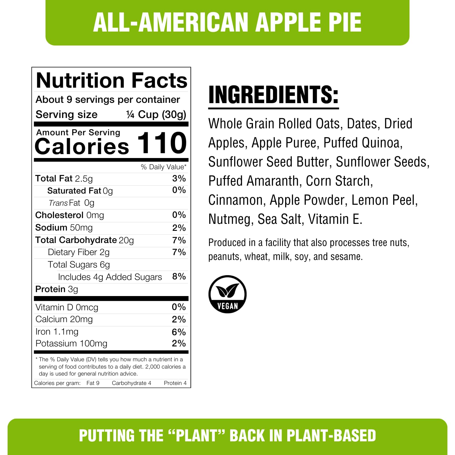 New & Improved! Better Crunch & More Flavor! Our All-American Apple Pie Granola Is Sweetened Only With Dates, Oil Free, Made With Whole Grains, And Always 100% Plant-Based. Our Plantstrong Foodies Deconstructed The Flavors Of A Traditional Apple Pie, And Recreated It Using Fruit And Whole Grains. All Our Granolas Are Handmade In Small Batches-Rip It Open! 9.0 Oz. Per Package. Not A Low Calorie Food. See Nutrition Panel For Further Information On Sugar And Calorie Content.