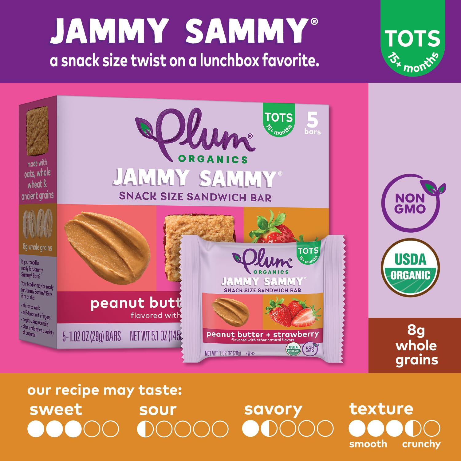 Q: What flavors are available for Plum Organics Jammy Sammy Snack Bars?A: In addition to the peanut butter and strawberry flavor, Plum Organics Jammy Sammy Snack Bars are also available in other flavors such as blueberry and oatmeal, providing variety for toddlers.