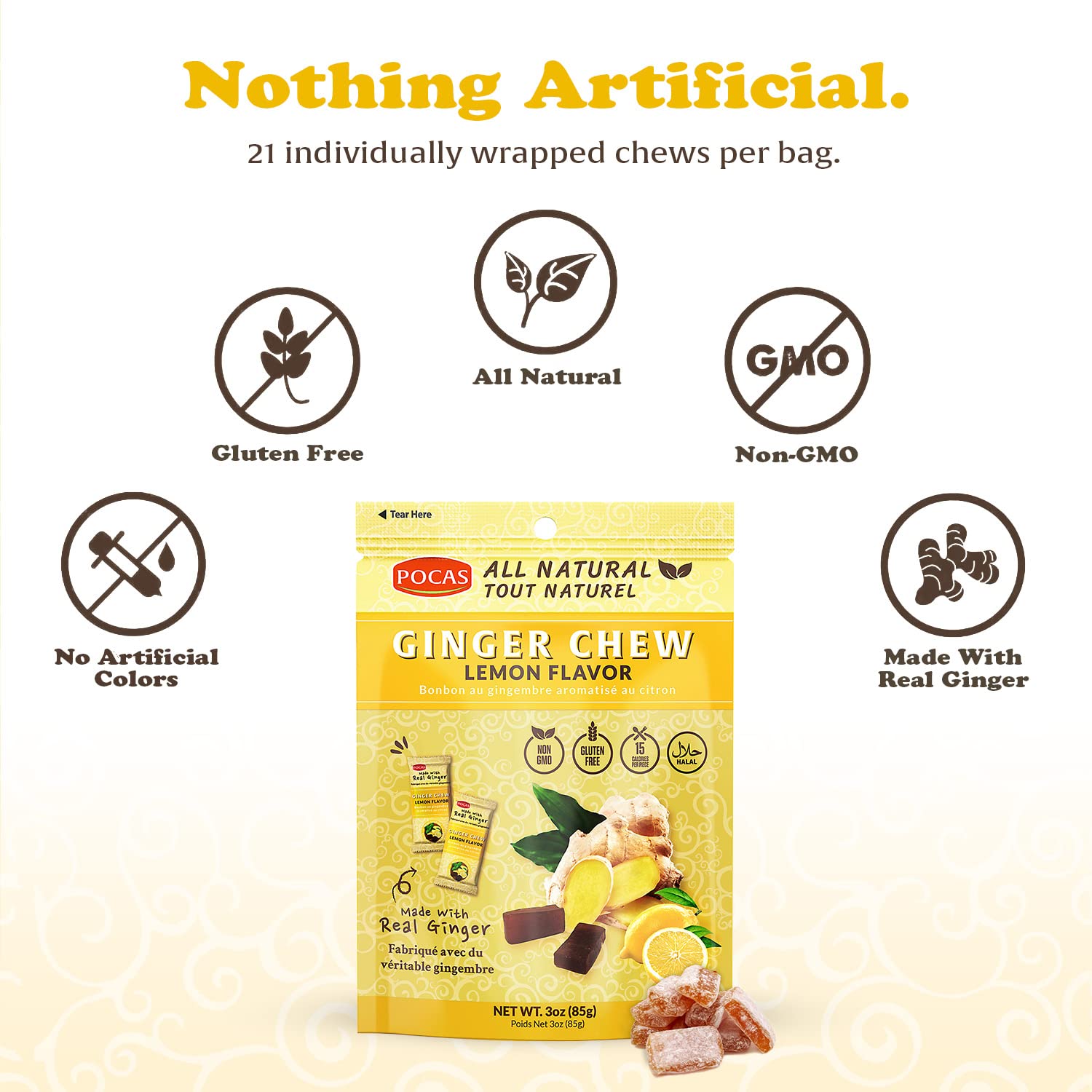 - Q: What are Pocas Lemon Ginger Chews made from? A: Pocas Lemon Ginger Chews are made with premium ginger and pure cane sugar, ensuring a delightful combination of sweet and zesty flavors. They are also non-GMO and gluten-free, making them a great choice for clean eating.