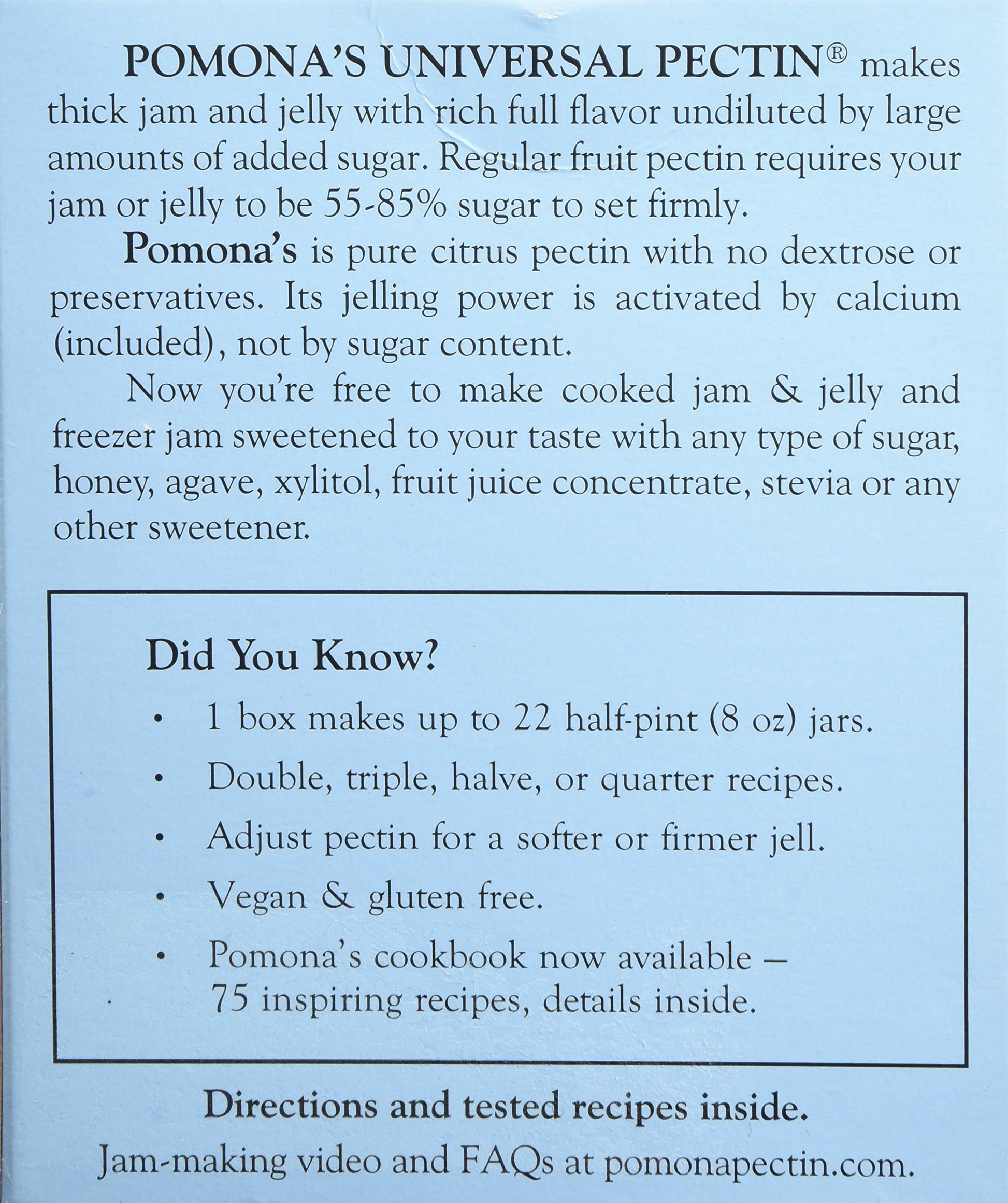 Pomona's Universal Pectin is a sugar-free, preservative-free, low methoxyl citrus pectin that is activated by calcium. Since it does not require sugar to jell, jams and jellies can be made with less, little or no sugar. Sugar-free, preservative-free, low-methoxyl citrus pectin. Sweeten jam & jelly to your taste with low amounts of any sweetener: sugar, honey, agave, maple syrup, frozen juice concentrate, stevia, xylitol, Sucanat, concentrated fruit sweetener, or Splenda and other artificial sweeteners. Each 1 oz box makes 2 to 4 batches (about 5 – 8 oz jars per batch). Recipes can be doubled or tripled. Each box contains pectin powder, calcium powder, directions, and recipes. Keeps indefinitely. Gluten Free, Vegan, and Non-GMO.
