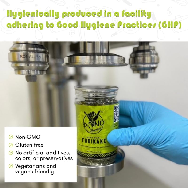 - Q: What is Pono Hawaiian Nori Komi Furikake Rice Seasoning made of? A: Pono Hawaiian Nori Komi Furikake Rice Seasoning is made from premium ingredients including nori seaweed, seaweed powder, and white sesame. It is gluten-free, non-GMO, and contains no artificial colors, flavors, or preservatives.