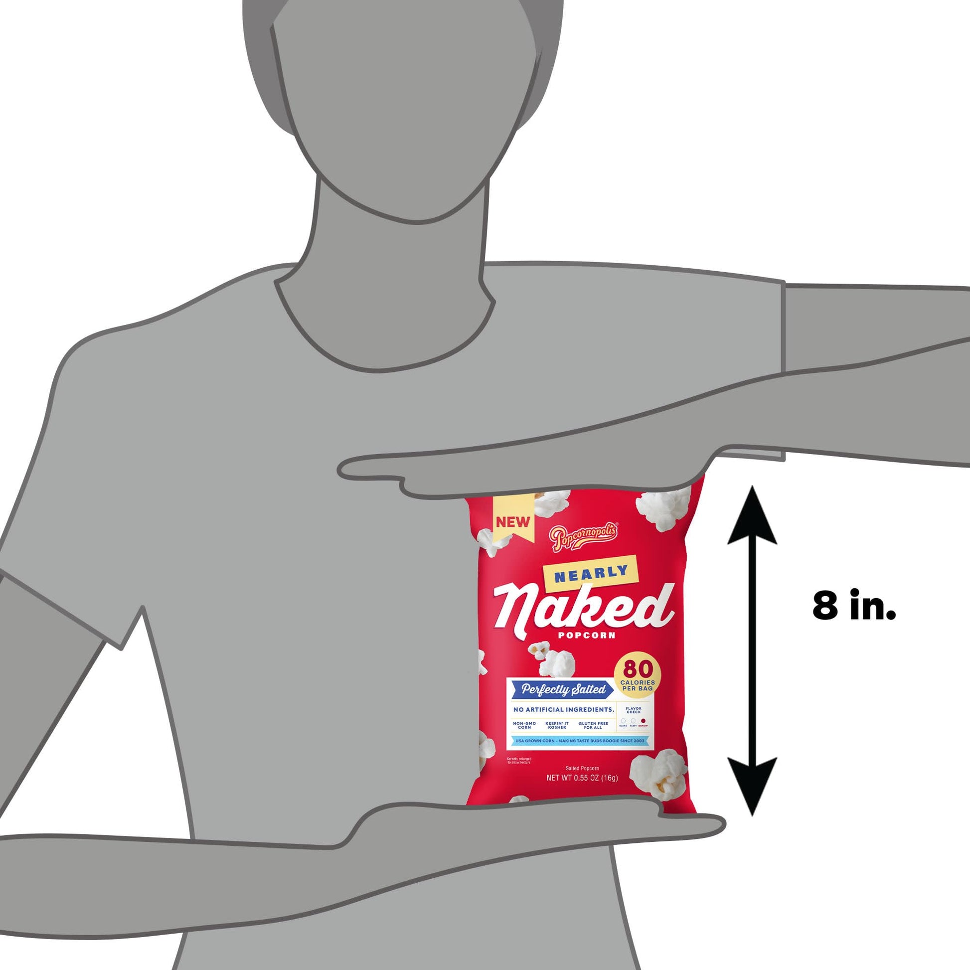 • Q: What are the serving sizes for Popcornopolis Nearly Naked popcorn? A: The popcorn comes in handy single-serve size bags, each containing 0.55 ounces, perfect for on-the-go snacking, movie nights, or sharing at parties.