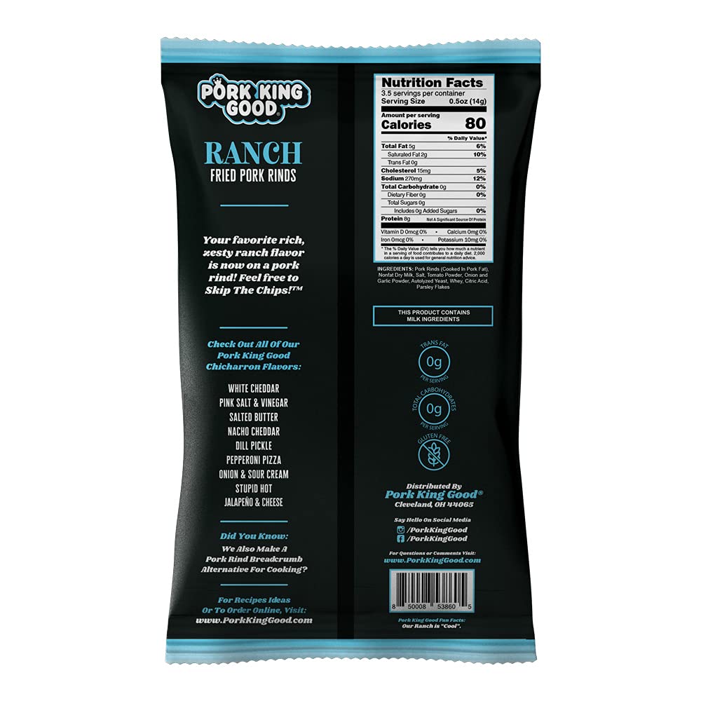 We At Pork King Good Can Proudly Say That Weve Developed The Most Insanely Delicious Chicharrones Out There, In Game-Changing Flavors That Are Changing Snacking As We Know It For Good! Light, Salty, Crunchy, Melt-In-Your-Mouth Whisps Of Deliciousness, That Double As A Deliciously Satisfying Zero Carb And Sugar-Free Treats! Pork King Good Pork Rinds Are Not Just Any Old Snack Food. Theyre The Ultimate Naturally Low-Carb And High Protein Bite! Our Ranch Flavored Pork Rinds Feature The Tangy, Delicious Ranch Flavor Of Your Favorite Chips, Without The Carbs!