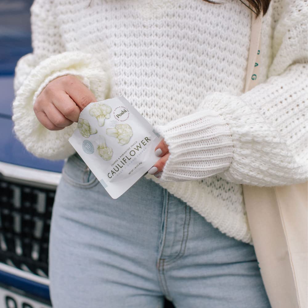 - Q: What is the calorie content of POSHI Cauliflower Vegetable Snack? A: POSHI Cauliflower Vegetable Snack is ultra-low in calories, making it an excellent guilt-free snack choice. Each bag contains only real food without empty calories, so you can enjoy it without compromising your diet.