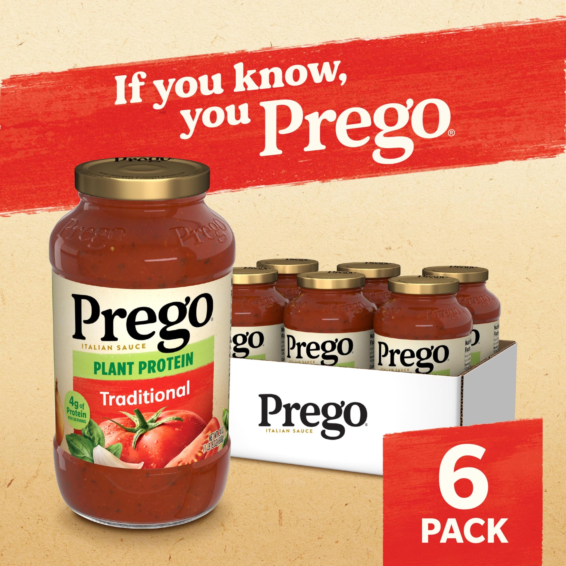 Q: What is the size of the packaging for Prego Plant Protein Traditional Pasta Sauce?A: Prego Plant Protein Traditional Pasta Sauce is available in a case of six 24 oz jars, providing plenty of sauce for multiple meals.