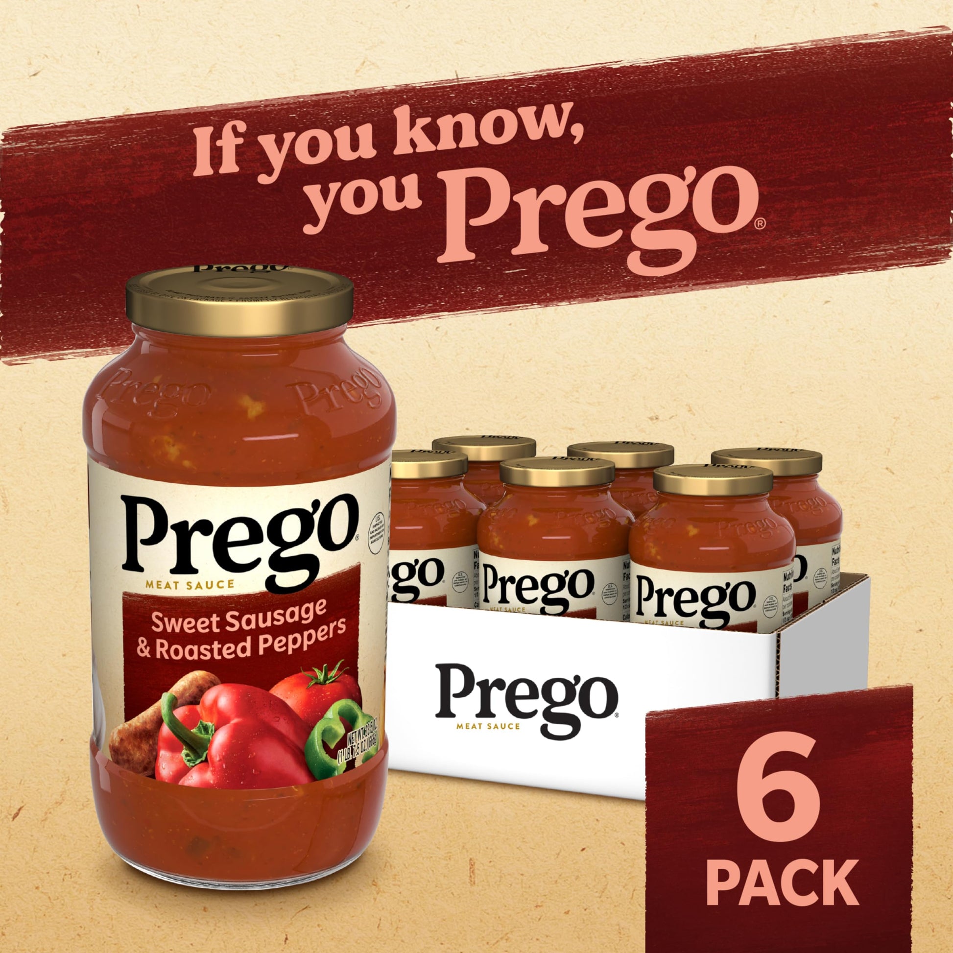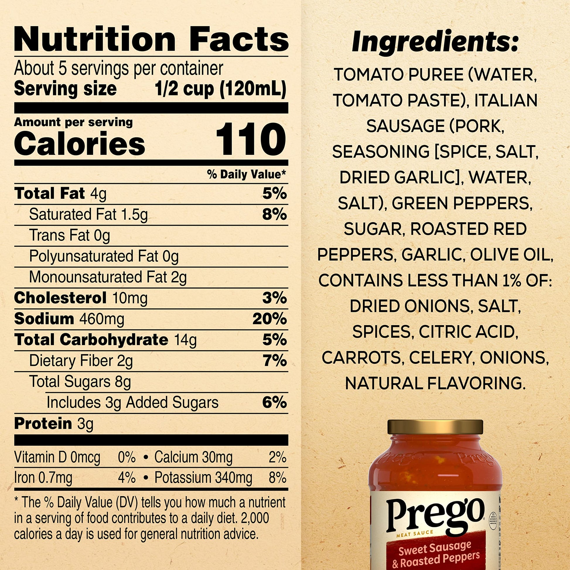 Be The Hero At Dinner With Prego Sweet Sausage And Roasted Peppers Pasta Sauce. Versatile And Delicious, This Classic Red Sauce Features The Bold Flavors Of Tomatoes And Sausage, A Hearty Blend Of Roasted Bell Peppers And Onions, And A Touch Of Olive Oil. This Pasta Sauce With Meat Has A Taste Everyone Loves And A Thick Texture That Doesnt Water Out, Making It A Perfect Pairing With Any Pasta. This Prego Pasta Sauce Is Gluten Free And Made Almost Entirely Of Vegetables For A Spaghetti Sauce You Can Feel Good About. Each Half Cup Serving Of This Sauce Provides 40 Percent Of Your Daily Vegetables, Giving You A Sauce Thats As Nutritious As It Is Tasty. Top Off Any Pasta With Prego Sweet Sausage And Roasted Peppers Meat Sauce For A Quick, Family-Pleasing Meal, Or Use It As A Base For Your Favorite Recipes. The Tomato Sauce Jar Top Is Easy To Close And Store In The Refrigerator For Leftovers. Give Your Family The Taste Everyone Loves With Prego. In Addition To Sweet Sausage And Roasted Peppers Meat Sauce, Prego Offers A Variety Of Other Crowd-Pleasing Favorites, Including Chunky Tomato, Garlic And Onion Italian Sauce, Mushroom And Green Pepper Sauce And More!