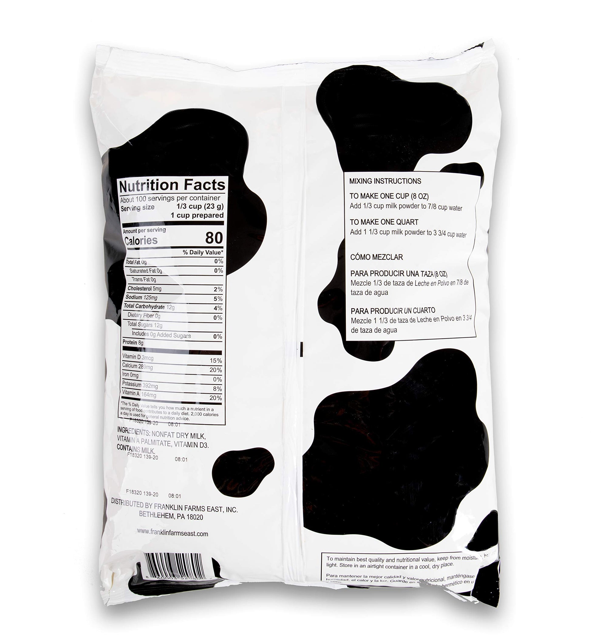 Premium-Grade Nonfat Dry Milk From Franklin Farms East (Product Of Usa). 30% Protein And 30% Rda Of Calcium In Every 1/3 Cup Serving, Plus Added Vitamin A And D3. Instantized So It Dissolves Quickly, Even In Cold Water. Not Only The Freshest, Best Tasting Product, But You'Re Supporting Small Family-Owned Businesses. Just Add 7/8 Cup Of Water To 1/3 Cup Of Nfdm For Skim Milk Equivalent, Or Use As An Ingredient For Protein Shakes, Smoothies And More. Packaged Economical Bags, These Taste Great For Up To A Year Or More When Stored In A Cool Place.