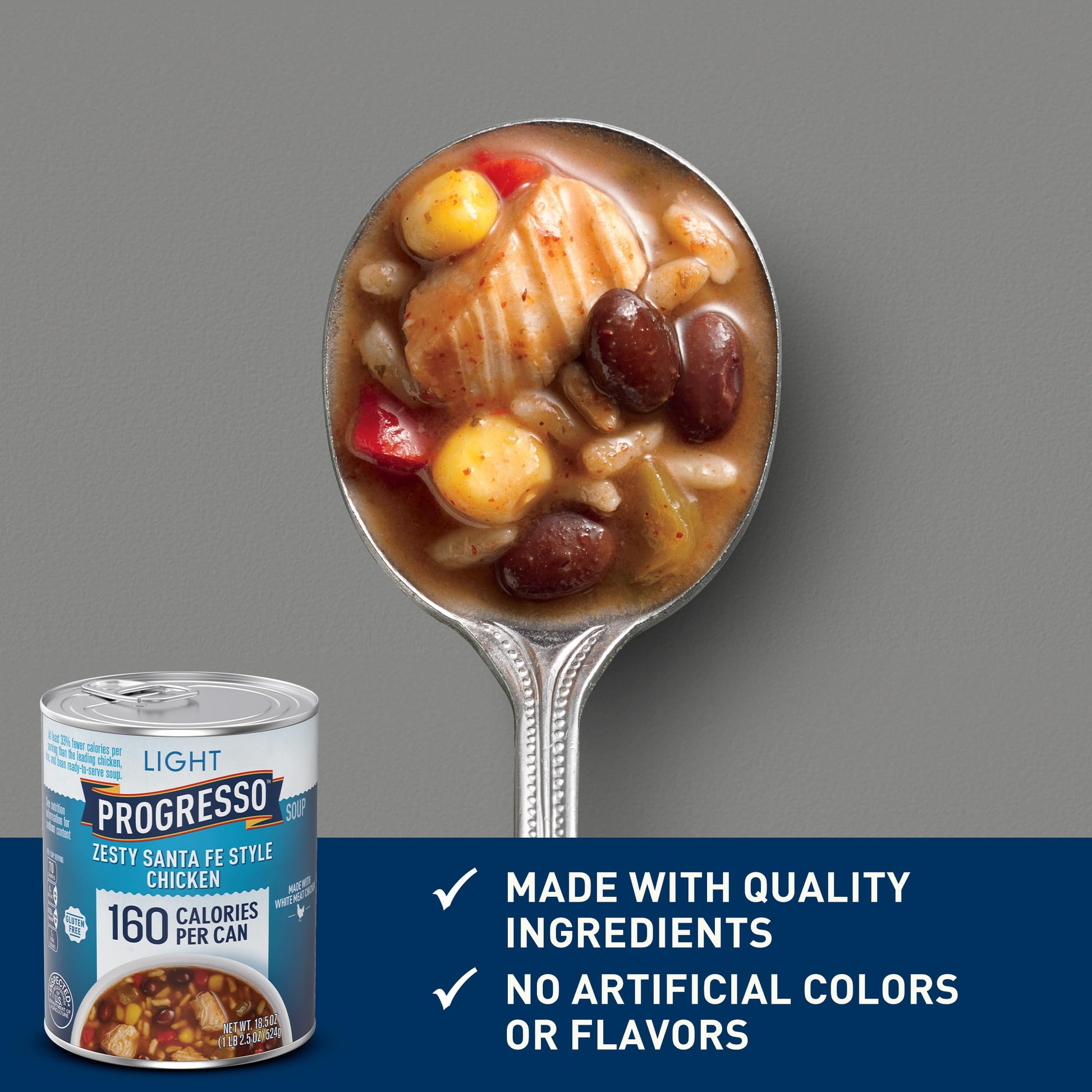 Progresso Light Zesty Santa Fe Style Chicken Soup Has At Least 33% Fewer Calories Per Serving Than The Leading Chicken, Rice And Bean Ready-To-Serve Soup*. This Gluten-Free Soup Includes Brown Rice, Black Beans, Green Sweet Pepper, Red Bell Pepper, Corn And Chicken. *Progresso Light: 70 Calories, 1G Fat Per Serving. Leading Chicken, Rice, And Bean Ready-To-Serve Soup: 140 Calories, 2G Fat.