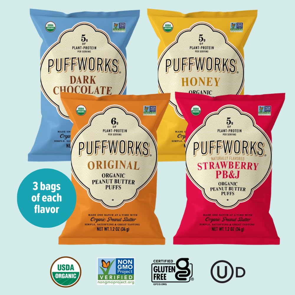- Q: What is the packaging size of the Puffworks Four Flavor Variety Pack? A: The Puffworks Four Flavor Variety Pack contains 12 bags, each weighing 1.2 ounces. The pack includes three bags of each flavor: Original, Dark Chocolate, Honey, and Strawberry PBJ.