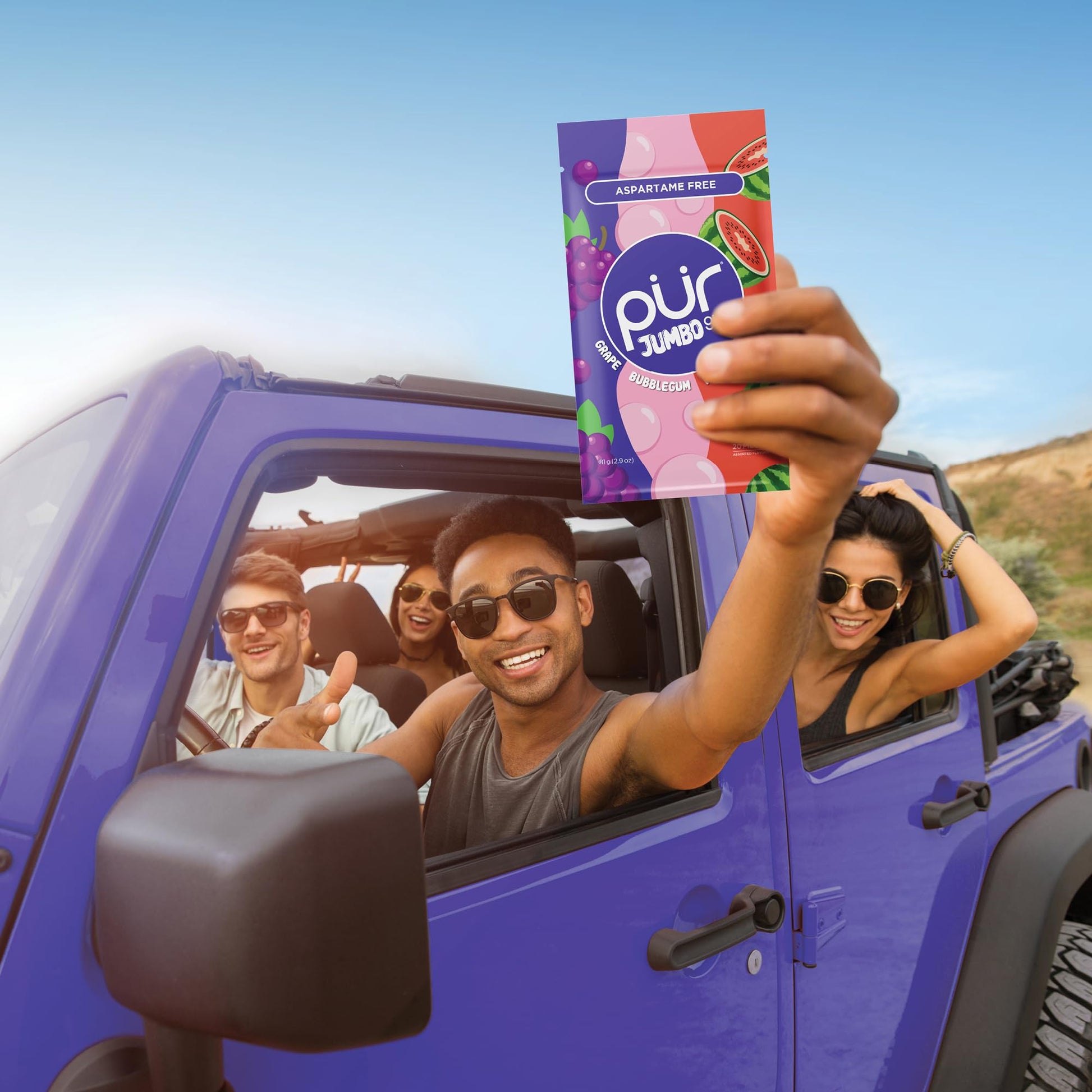 Q: What flavors does PUR Jumbo Gum come in?A: PUR Jumbo Gum is available in delicious fruity flavors including bubblegum, grape, and watermelon, providing a satisfying and enjoyable chewing experience.