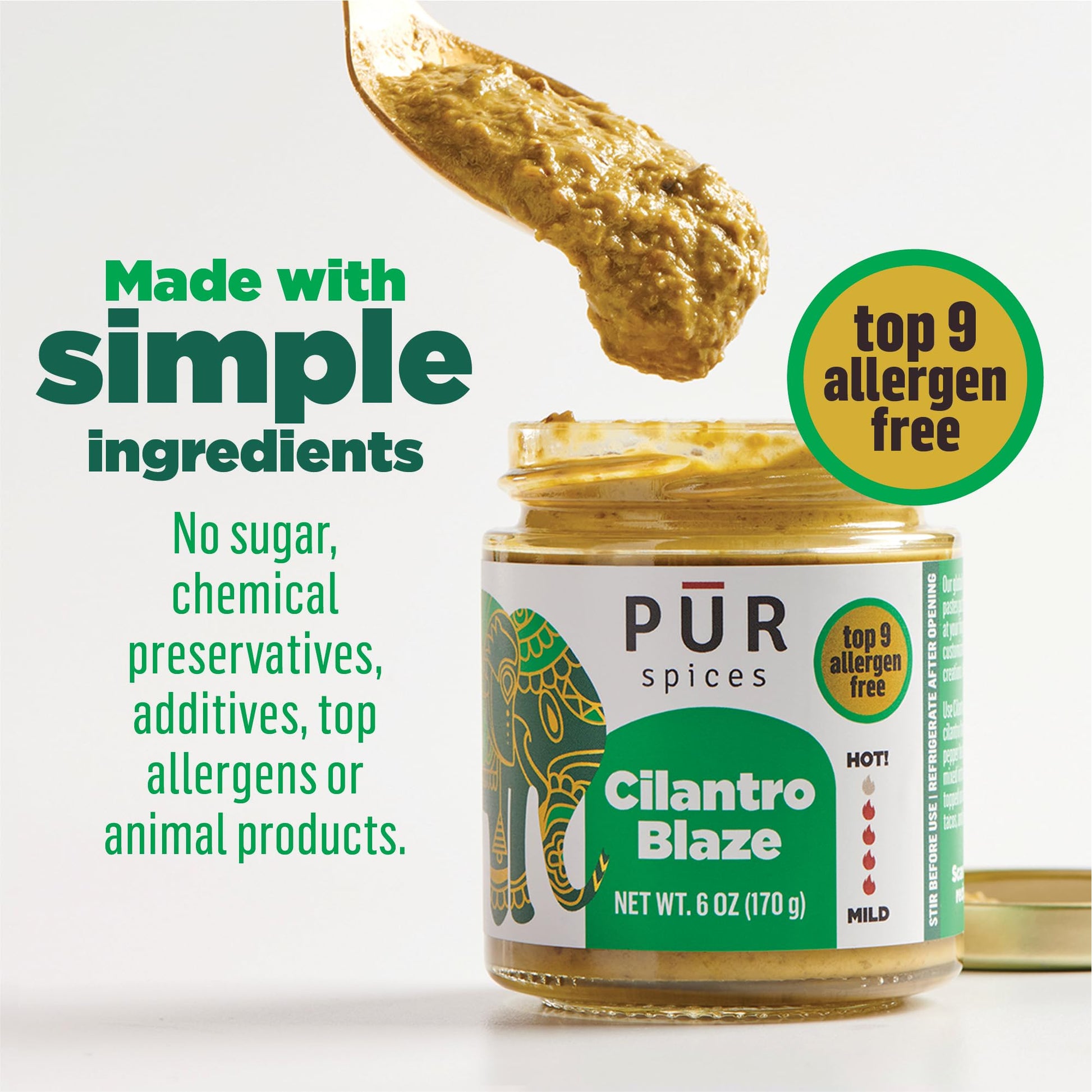 PUR Spices Cilantro Blaze I Hot Sauce & Tangy Cilantro Chutney I Fresh Cilantro, Garlic, Lime and Hot Peppers I Plant Based, Glu