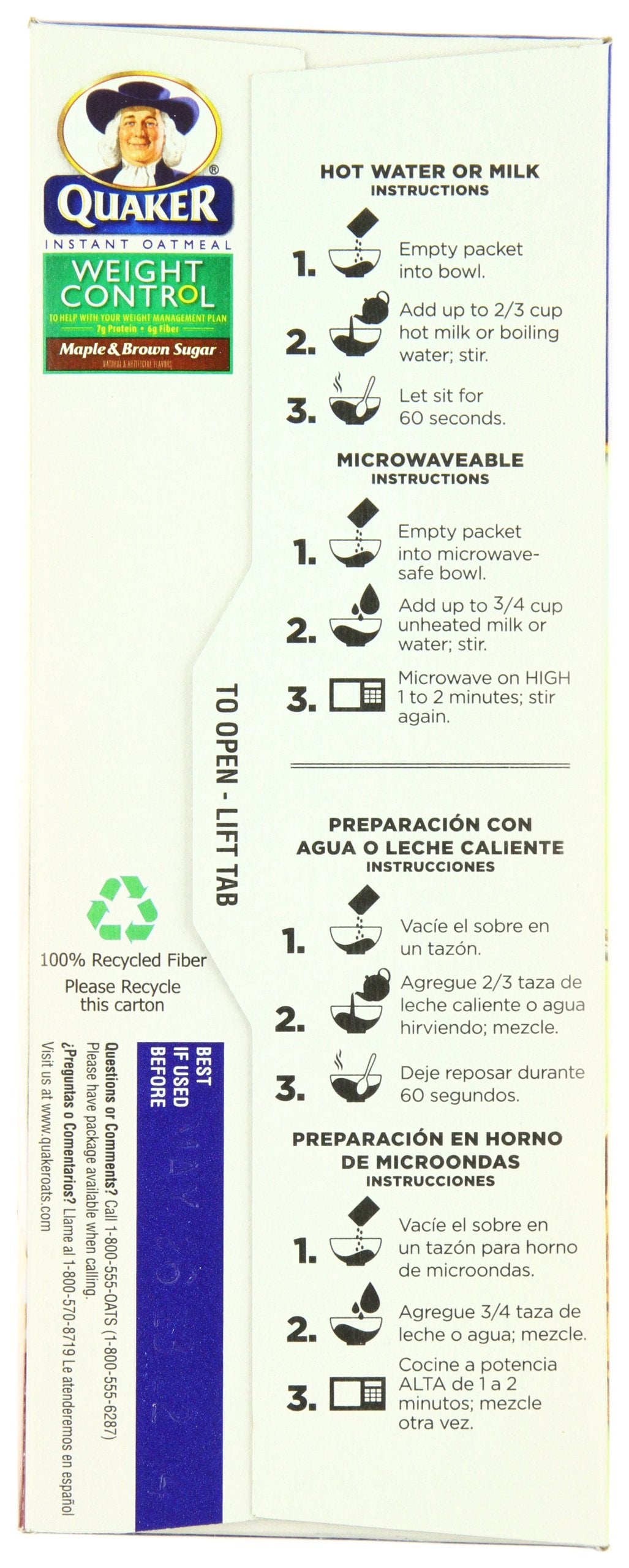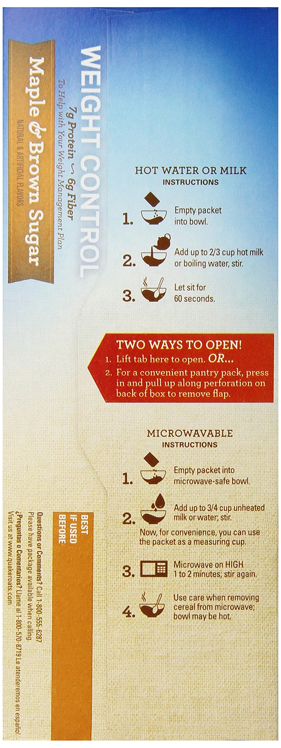Product DescriptionDo you love the rich flavors of maple and brown sugar? Since it's our most popular flavor, we're pretty sure you do. Our delicious Weight Control Maple Brown Sugar Instant Oatmeal was designed to help you with your weight management plan without sacrificing any of the great flavor you've come to expect from Quaker.From the ManufacturerDo you love the rich flavors of maple and brown sugar? Since it's our most popular flavor, we're pretty sure you do. Our delicious Weight Control Maple Brown Sugar Instant Oatmeal was designed to help you with your weight management plan without sacrificing any of the great flavor you've come to expect from Quaker.