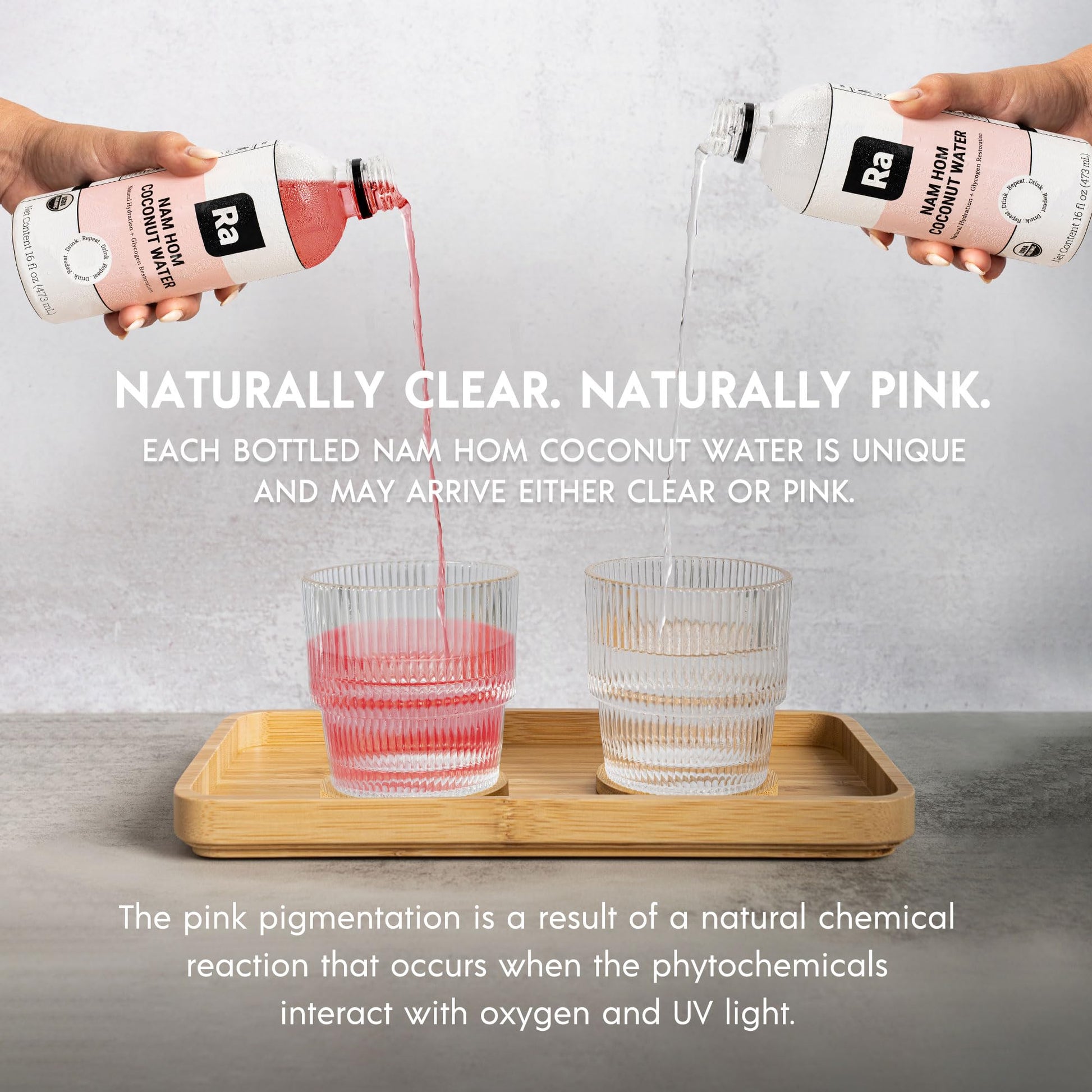 • Unique Color Variation: Each bottle of RA Coconut Water may appear either clear or pink. This natural pink hue results from the interaction of phytochemicals with oxygen and UV light, showcasing the beverage's pure, unprocessed nature.