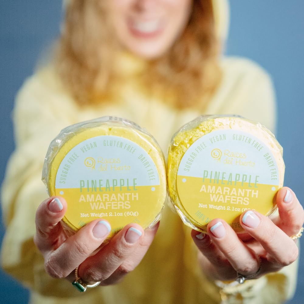 Q: What ingredients are used in Raíces del Huerto Amaranth Wafers?A: These wafers are made with real ingredients including amaranth, oats, and coconut powder, ensuring a natural and healthy snacking experience.