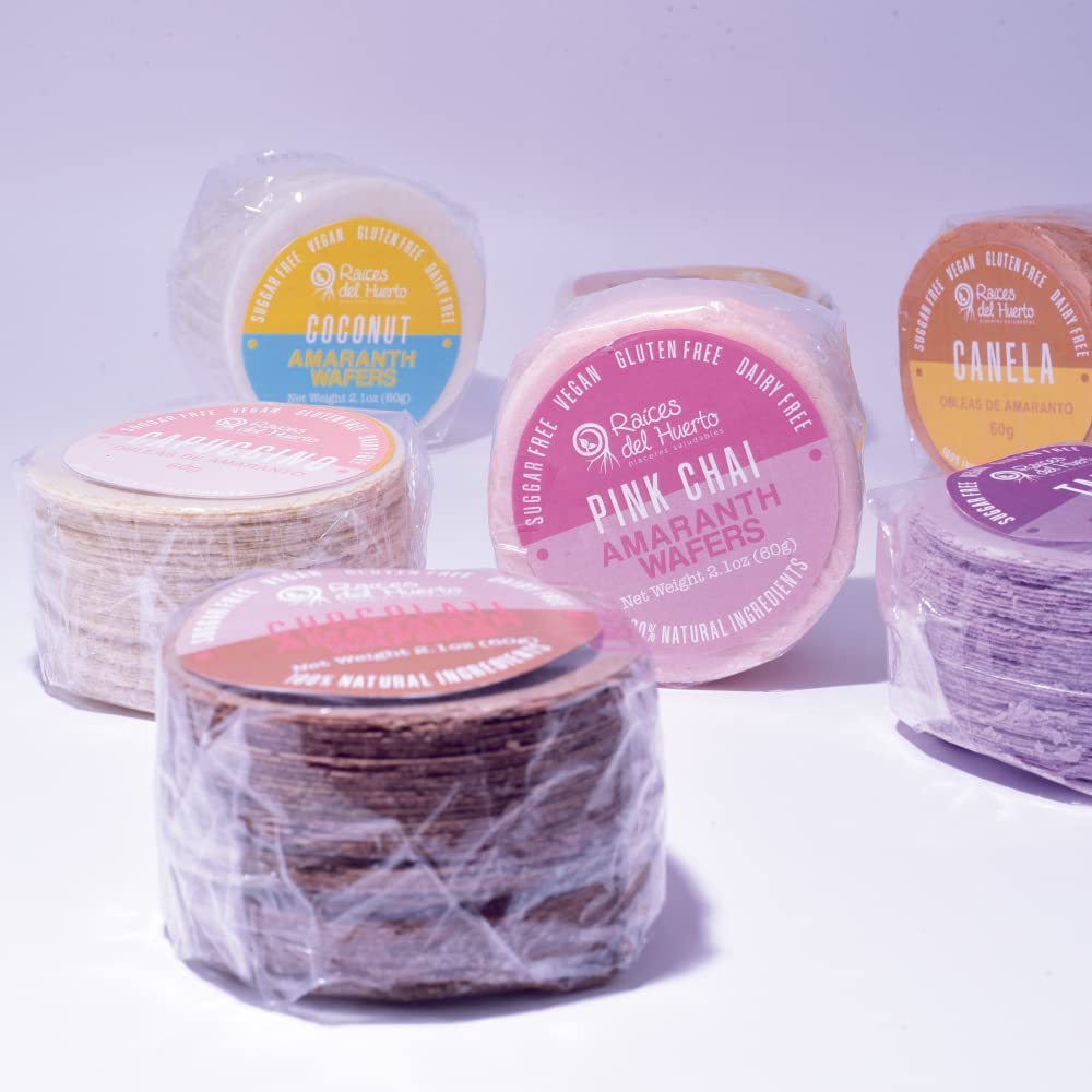 Q: What ingredients are used in Raíces del Huerto Amaranth Wafers?A: Raíces del Huerto Amaranth Wafers are made with real ingredients, including amaranth and oats. They are gluten-free, dairy-free, and sugar-free, with natural flavors such as mango, pineapple, and banana.