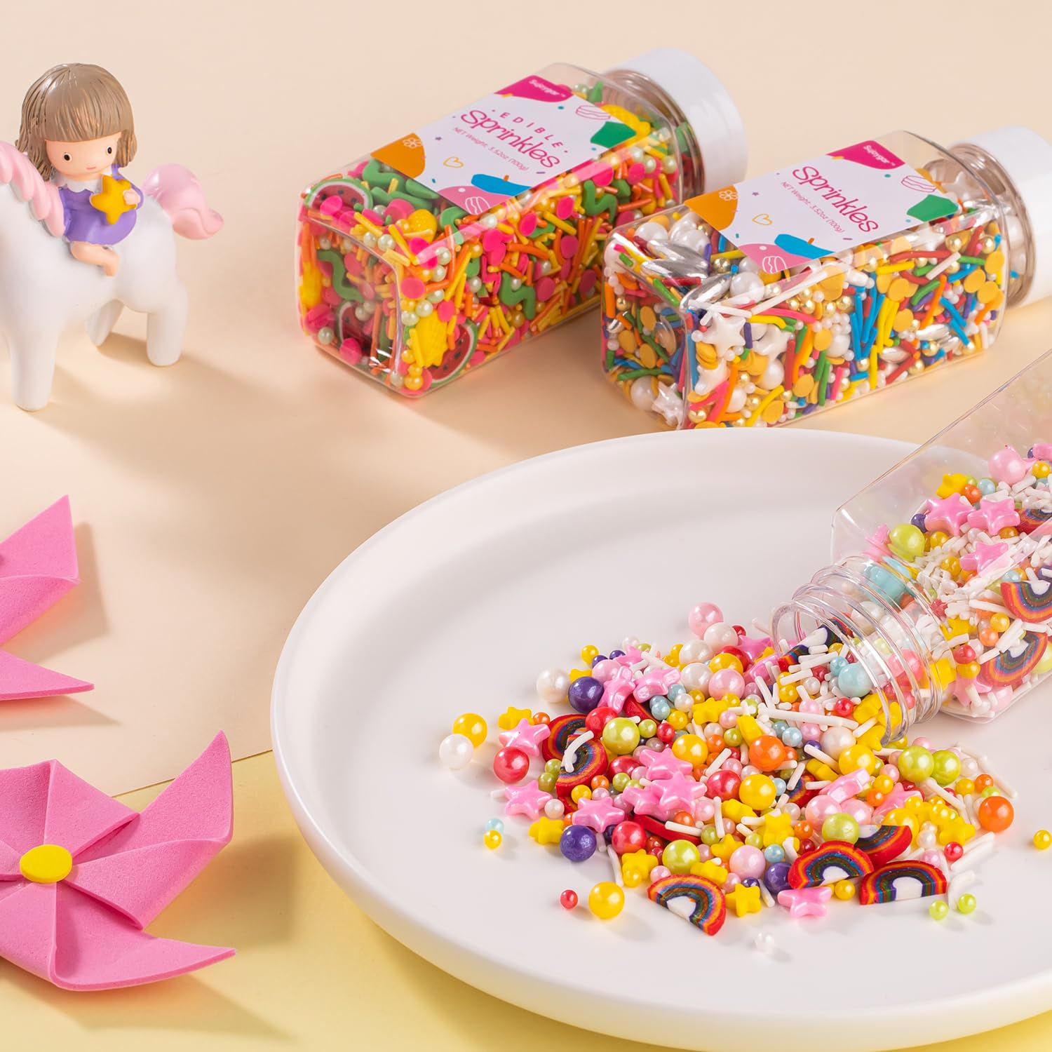 [ Rainbow Sprinkles ] Kosher Certified & Halal Certified Edible Sprinkles And 100% Msds Approved Production. Non Toxic And 100% Edible | [ Ingredients ] Glucose, Sugar, Corn Starch, Maltodextrin, Modified Starch, Cocoa Butter Substitute, Malt Syrup, Arabic Gum, Confection'S Glaze, Magnesium Stearate, Mica Based Pearl Pigment, Vanilla Essence, Carnaubawax, Colors( Blue 1, Yellow 5, Yellow 6, Red 3, Red 40, Titanium Dioxide, Caramel) | [ Sprinkles For Cake Decorating ] Take An Appropriate Amount Of Edible Sprinkles And Put It On The Backed Cake To Decorate The Chocolate, Cakes, Cupackes, Macarons, Waffles And Ice Cream | [ Shelf Life ] Shelf Life Is 24 Months, Production Date Please See The Bottle | [ Customer Service ] If You Are Not Satisfied With Our Products Or Service, Please Feel Free To Contact Us By Email In Time. We Always Do Our Best To Settle Your Problems And Inquiries
