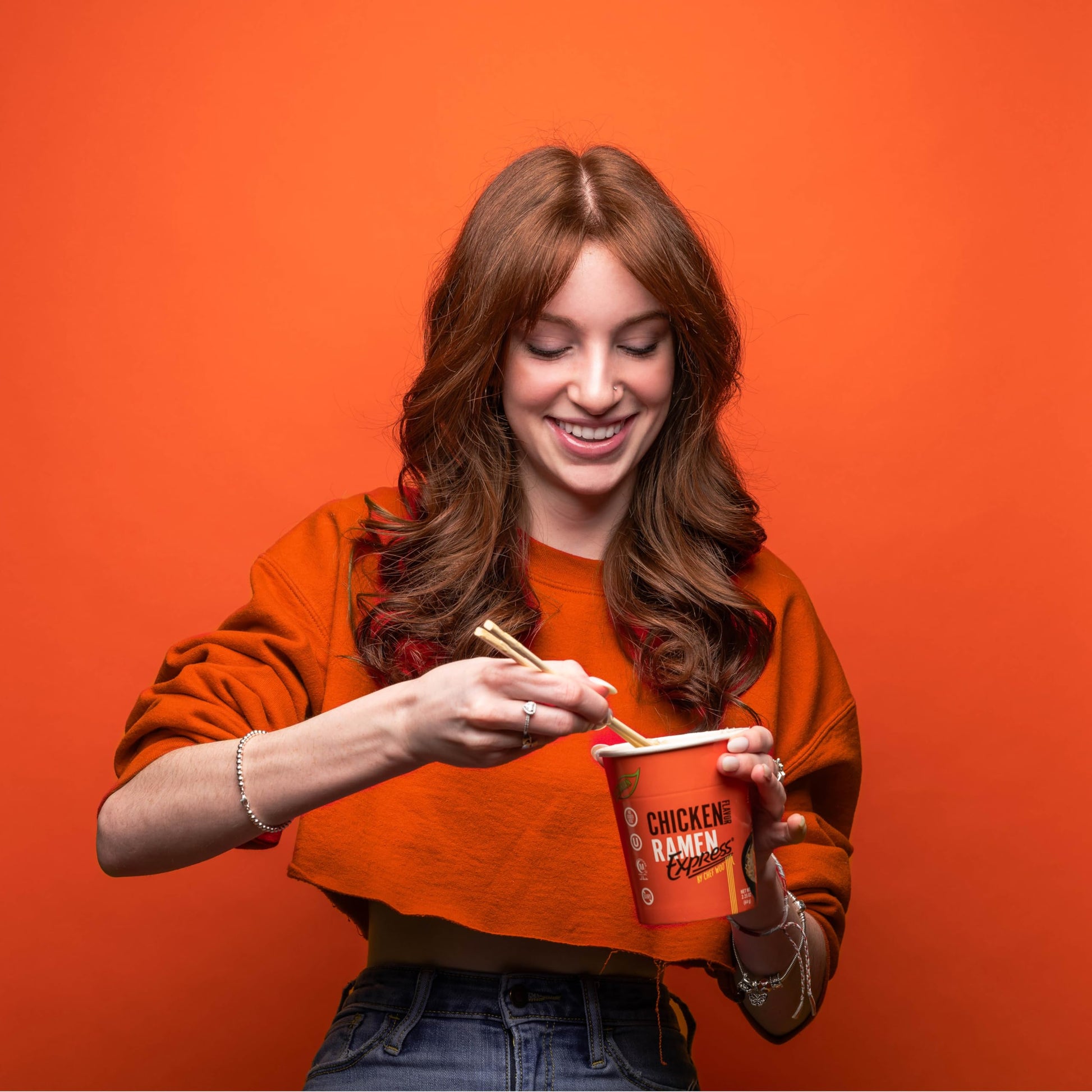 Veggie yumminess for the ramen lover. Feel good about your food. Even on the go. Weve prepared a savory chicken flavor ramen that doesnt harm a single chicken (or human). Ramen Express is lovingly made in the USA with absolutely no palm oil, TBHQ, MSG, GMO or animal byproducts, served in a biodegradable cup. Certified Kosher and certifiably delicious. Thats the Ramen Express way.