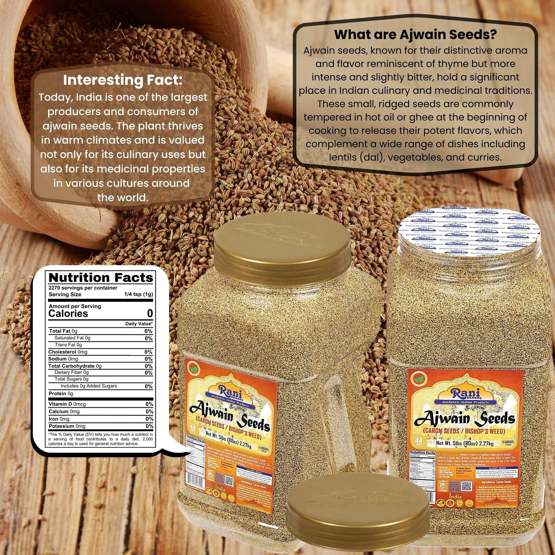 - Q: What is the size of the Rani Ajwain Seeds packaging? A: Rani Ajwain Seeds come in a bulk PET jar containing eighty ounces, which is equivalent to five pounds or approximately two point twenty-seven kilograms.