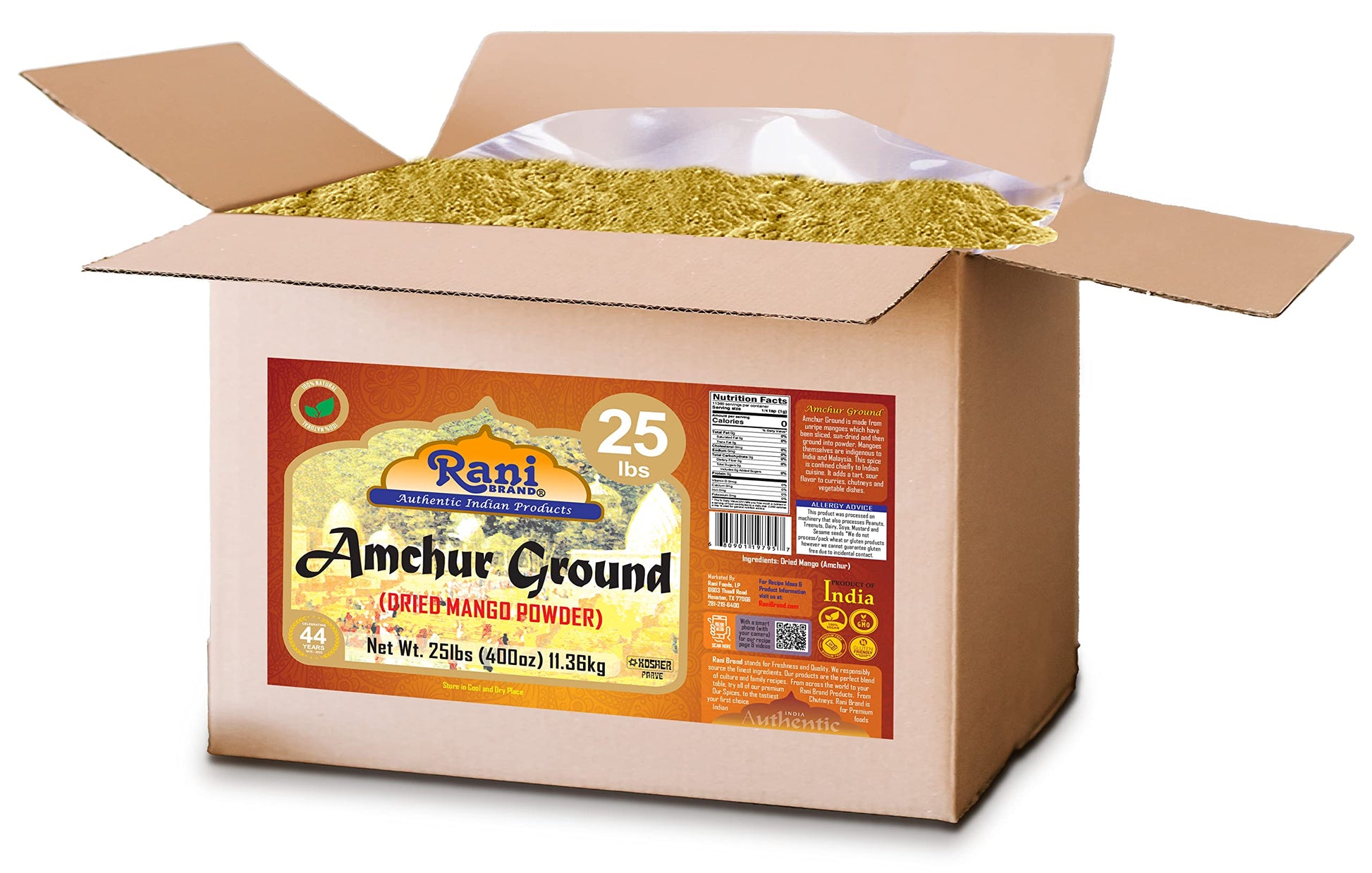 - Q: What is the weight of the Rani Amchur Ground Powder package? A: The package contains four hundred ounces, which is equivalent to twenty-five pounds or approximately eleven point thirty-six kilograms.