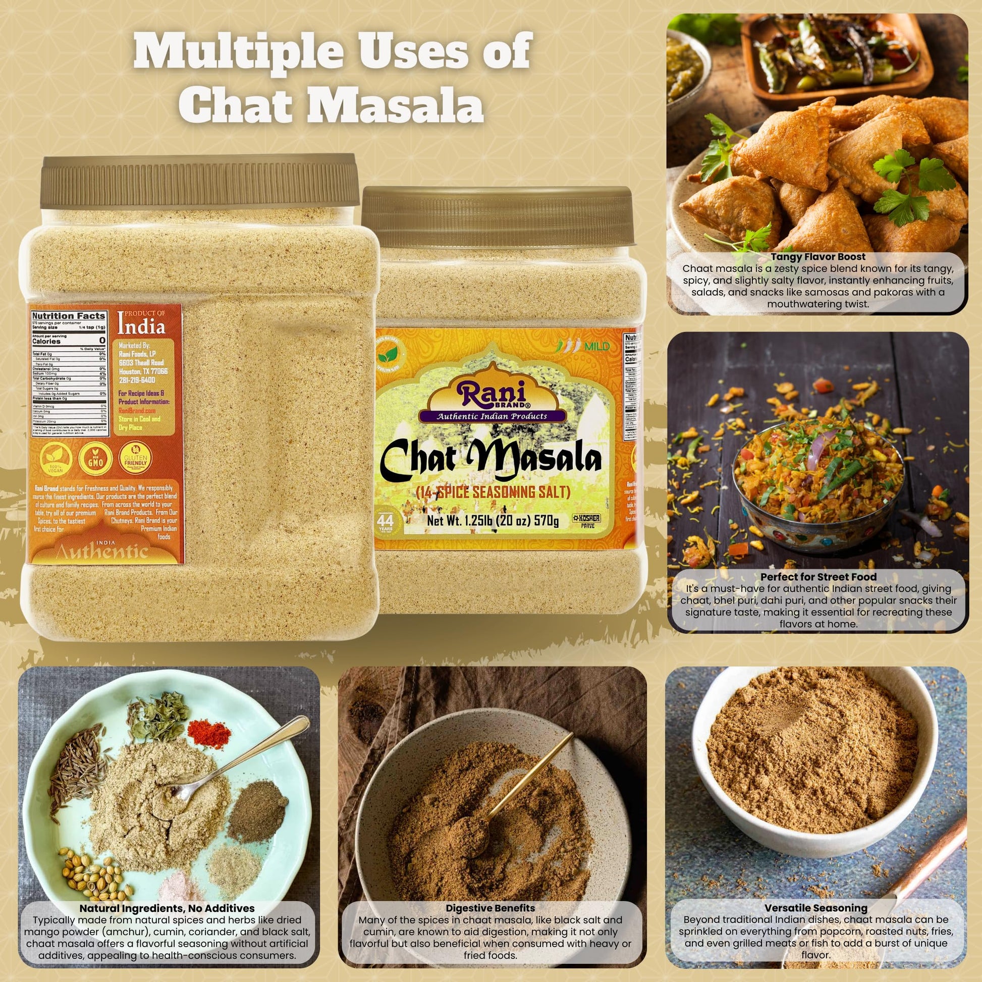 - Q: Is Rani Chat Masala suitable for special diets? A: Yes, Rani Chat Masala is 100% natural, vegan, gluten-friendly, and non-GMO. It contains no MSG or preservatives, making it a great choice for those with dietary restrictions or preferences.