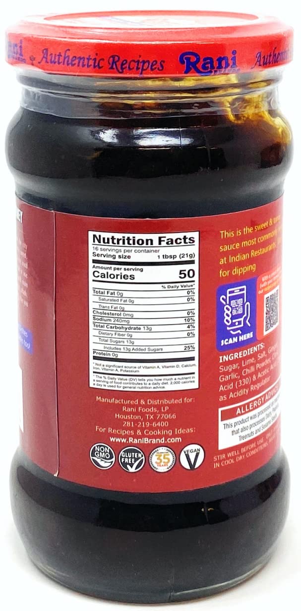 Q: What ingredients are in Rani Lime Sweet Mango Chutney?A: Rani Lime Sweet Mango Chutney is made from all-natural ingredients including diced green mangoes, sugar, vinegar, and a blend of spices. It is gluten-free, non-GMO, and contains no preservatives.