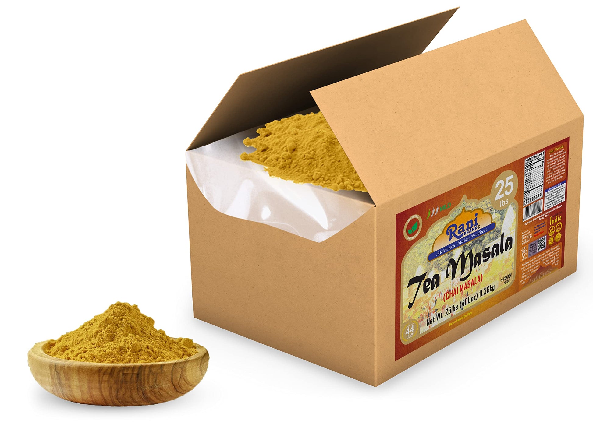 Q: What size packaging does Rani Tea (Chai) Masala come in?A: Rani Tea (Chai) Masala is available in a bulk box weighing 400oz (25lbs or 11.36kg), which makes it ideal for both home use and larger gatherings.