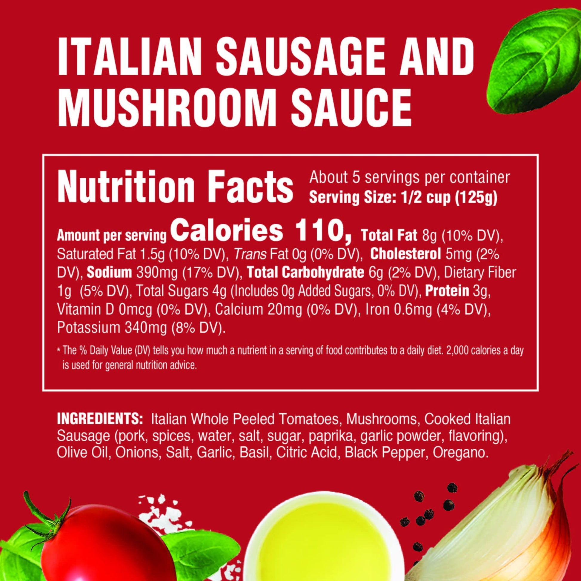 Bring home the famous taste of Raos Homemade Sausage and Mushroom. Raos Homemade Sauce is a premium, carb conscious pasta sauce made with only the finest ingredients. Delicious speaks for itself when enjoying this tomato sauce. Each batch of Raos Homemade Sausage and Mushroom Sauce is slow-cooked in small batches with high quality ingredients. These wholesome ingredients blend to create a pasta sauce that brings back memories of family dinners around the table. The Raos Sausage and Mushroom recipe stays true to its classic Italian roots making it the perfect carb conscious pasta sauce that is Keto-friendly. Raos Homemade sauce has no added sugar* making it a great spaghetti sauce youll want in your pantry. This premium pasta sauce tastes delicious, and is made with the finest ingredients, without any tomato blends, tomato paste, water, starches, added colors, or sugar.* Raos Homemade, originally born in New York, now brings authentic Italian flavor into your home. Raos Homemade Sausage and Mushroom Sauce is a versatile tomato sauce that offers truly traditional homemade Italian flavor, easily available anytime to pair with your preferred pasta, to use as an ingredient in your favorite recipe, or to accompany your favorite meatballs. *Not a low or reduced calorie food, see nutrition panel for further information on Sugar and Calorie content